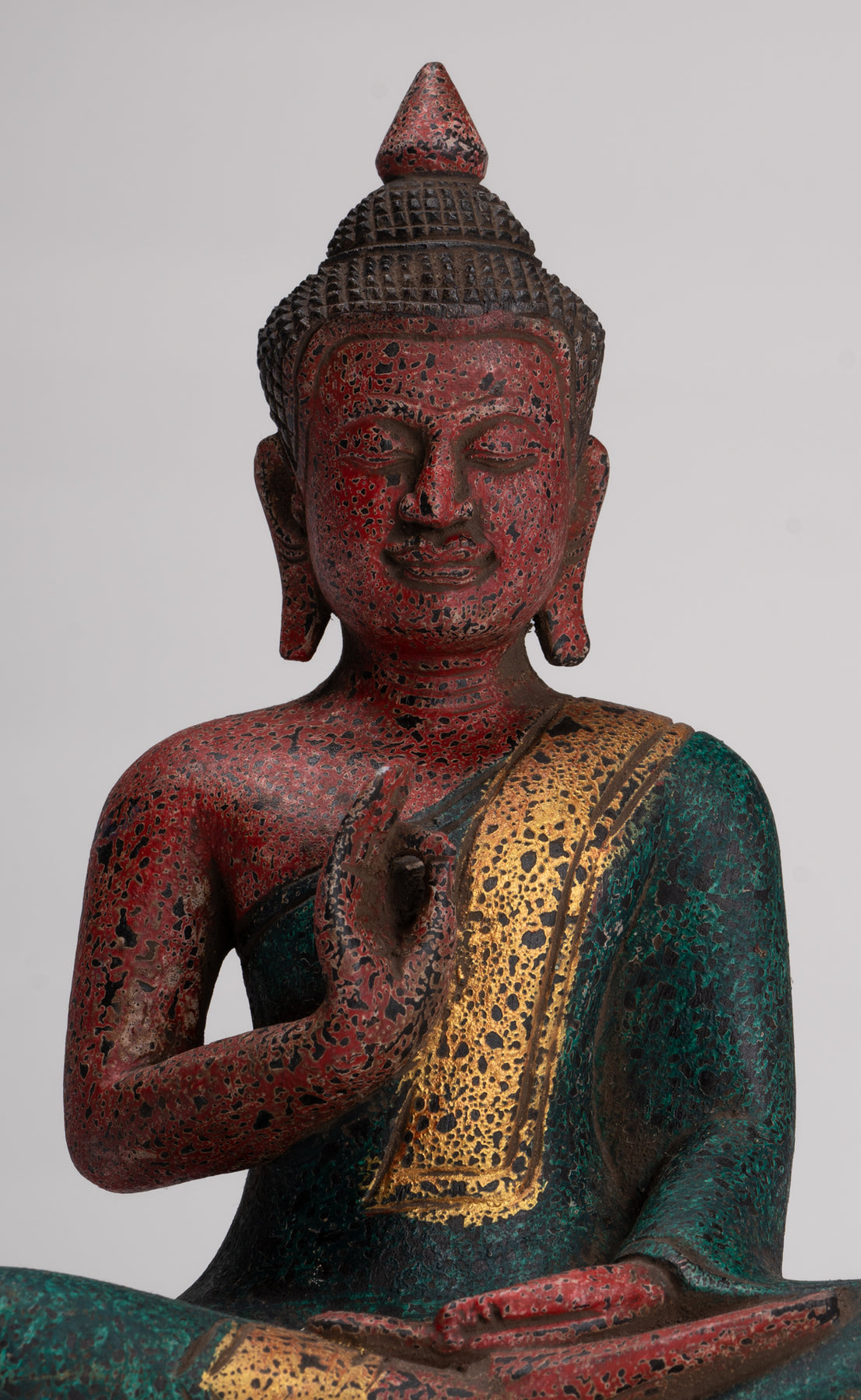 El Buda está sentado en la posición de medio loto con la mano derecha levantada frente a su pecho en el Dharmachakra Mudra. En sánscrito, dharmachakra significa la 'rueda del dharma'. Esta Mudra simboliza uno de los momentos más importantes de la vida de Buda, la ocasión en que predicó a sus compañeros el primer sermón después de su iluminación en el parque de ciervos en Sarnath. Por lo tanto, denota el ajuste en movimiento de la rueda de la enseñanza del Dharma. En este mudra, el pulgar y el dedo índice de ambas manos tocan sus puntas para formar un círculo. Este círculo representa la rueda del dharma, o en términos metafísicos, la unión del método y la sabiduría.