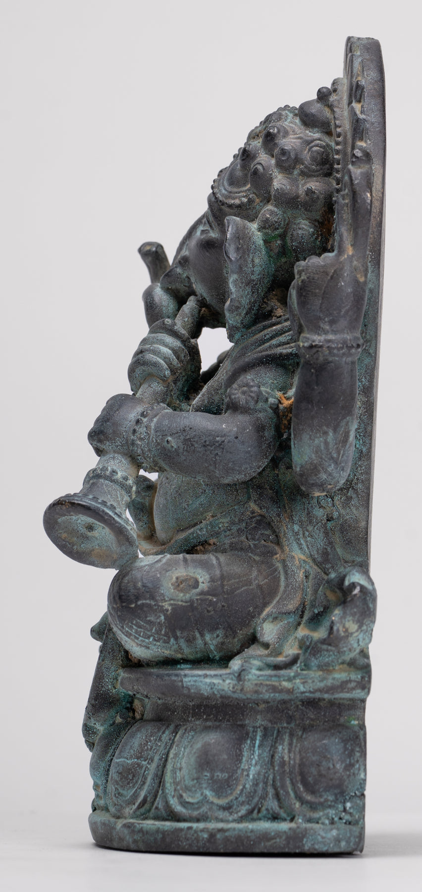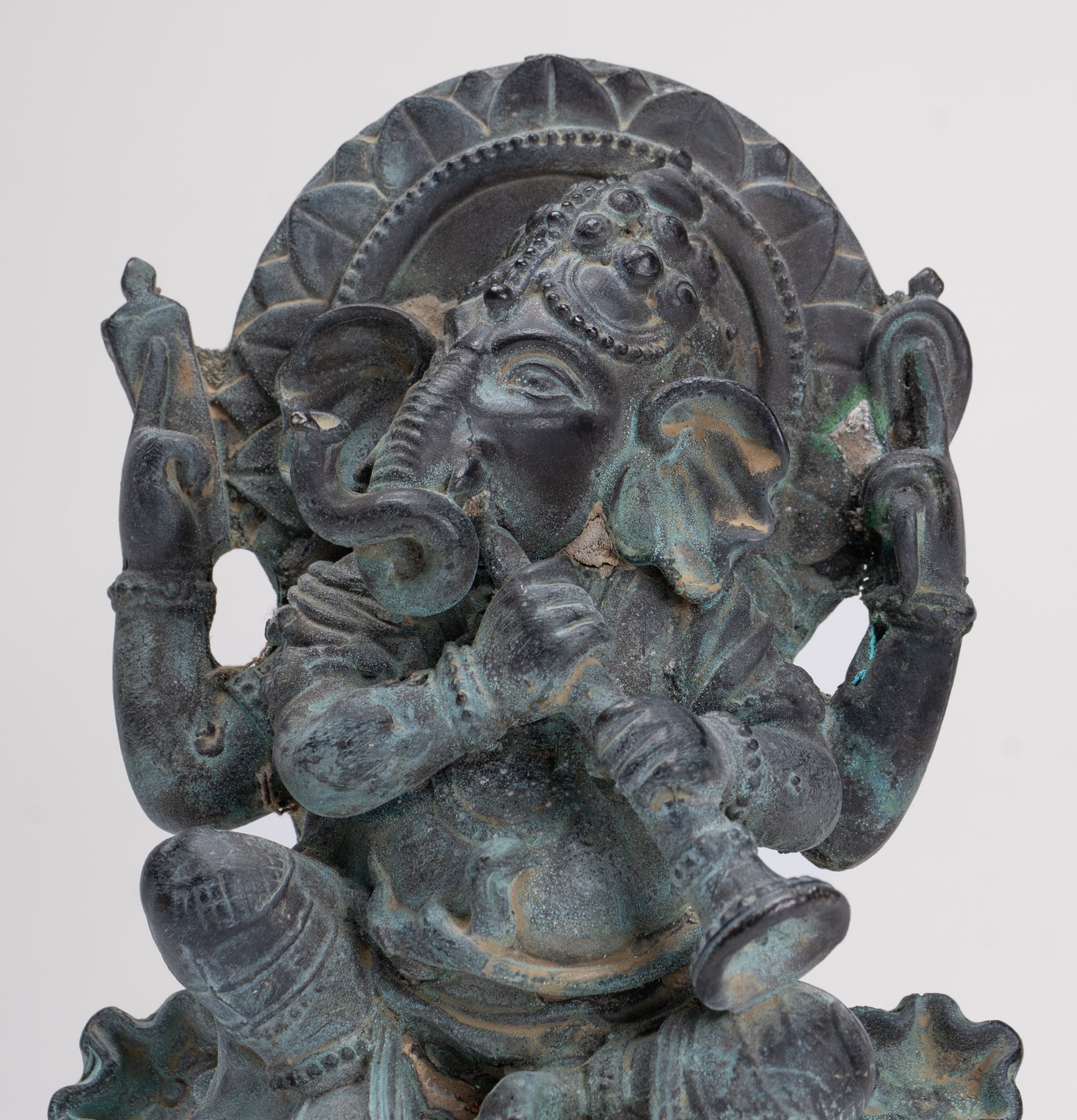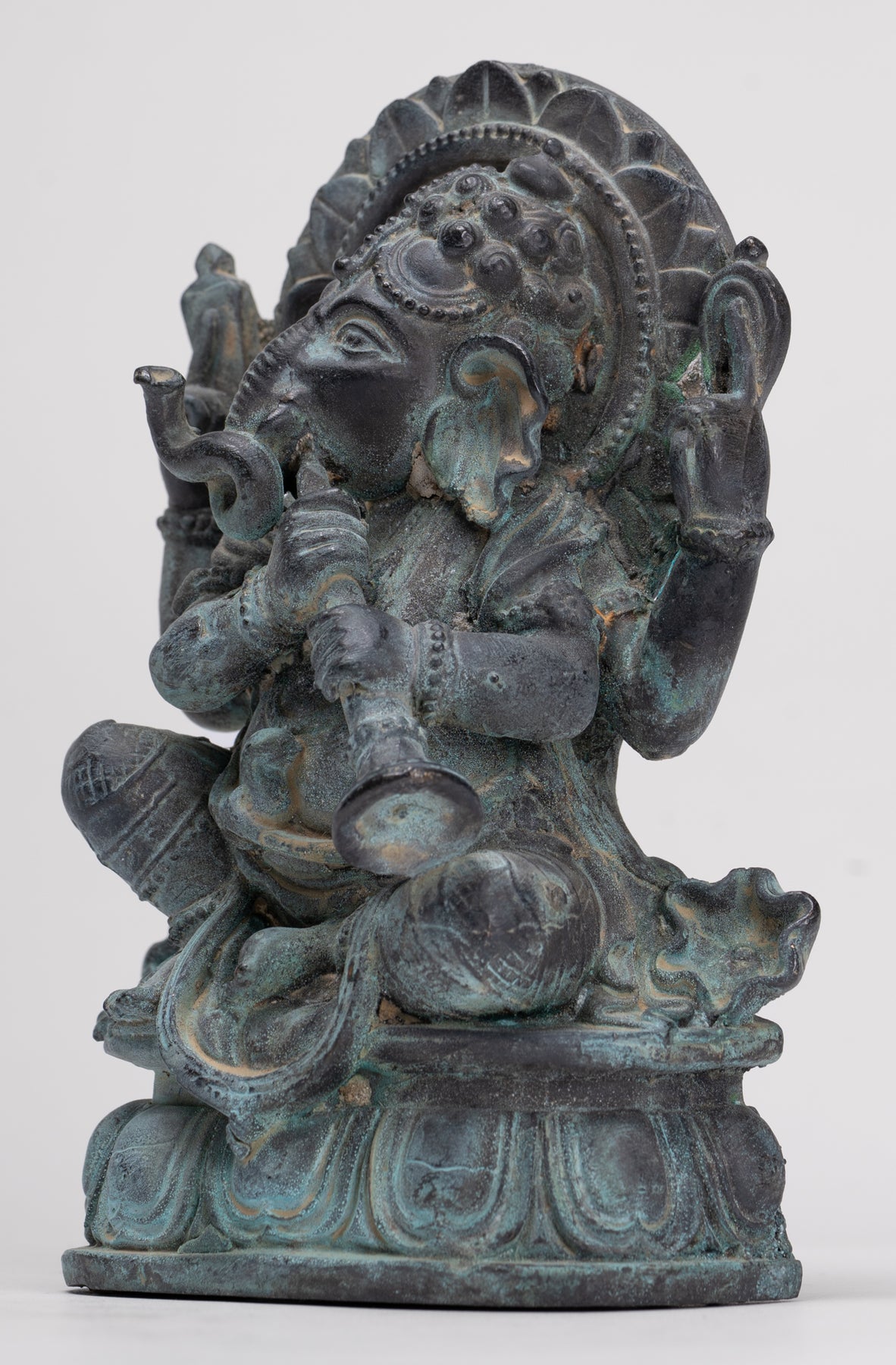 Si bien muchos reconocen que Ganesha posee sus atributos tradicionales como el aguijón, el loto o los dulces, una de las representaciones fascinantes y menos comunes muestra a Ganesha tocando una trompeta o un instrumento de viento similar, infundiendo su iconografía con ricas capas simbólicas.
