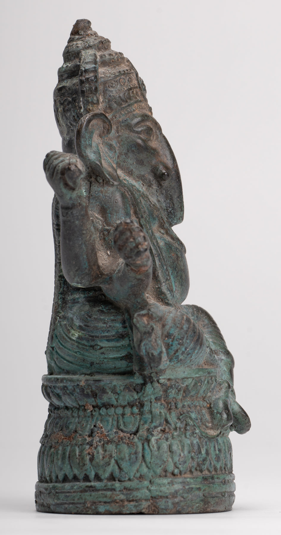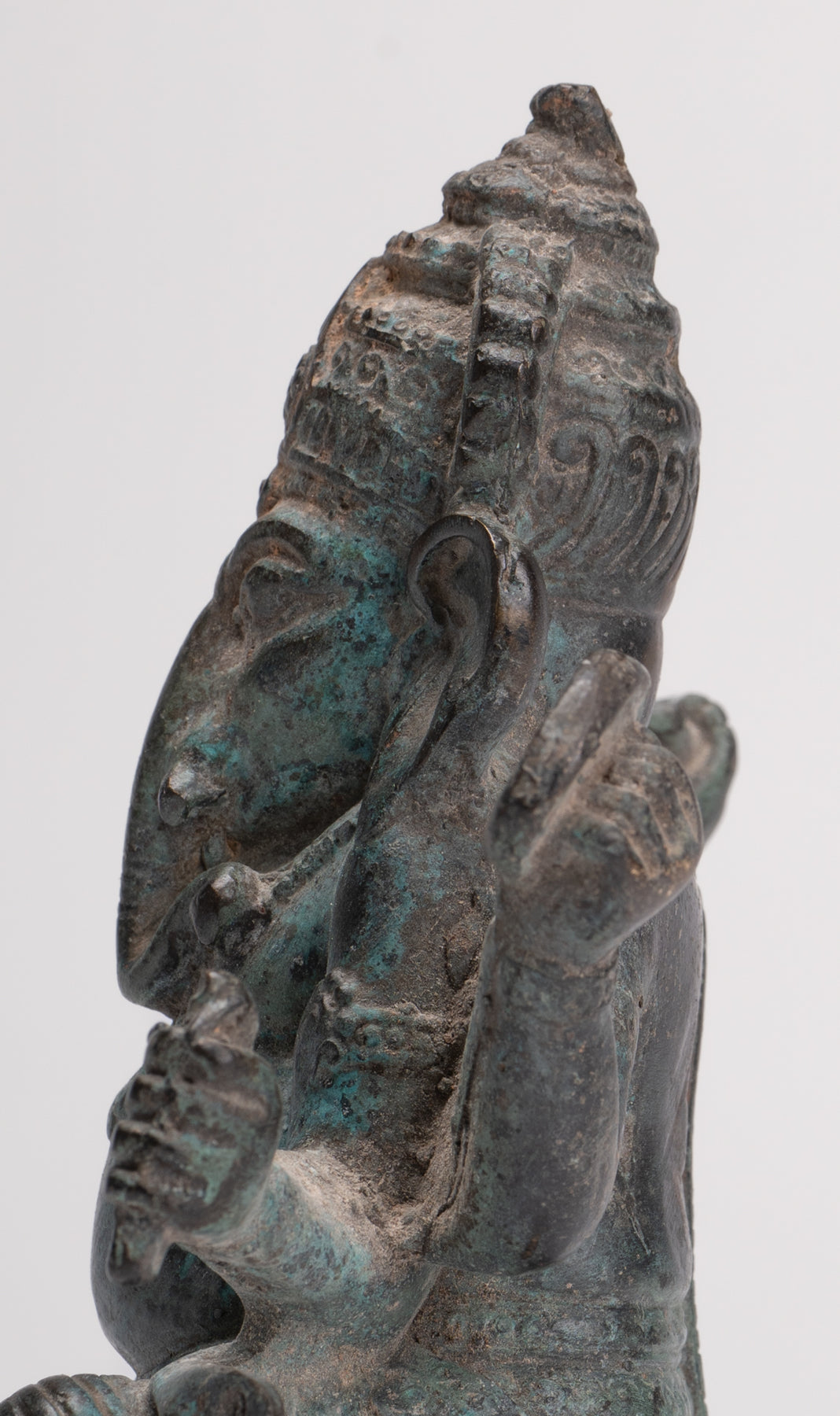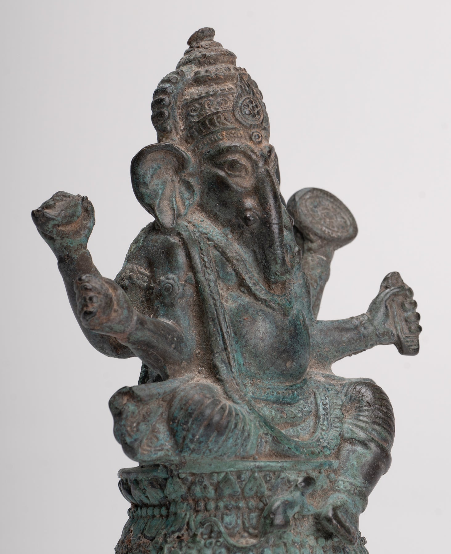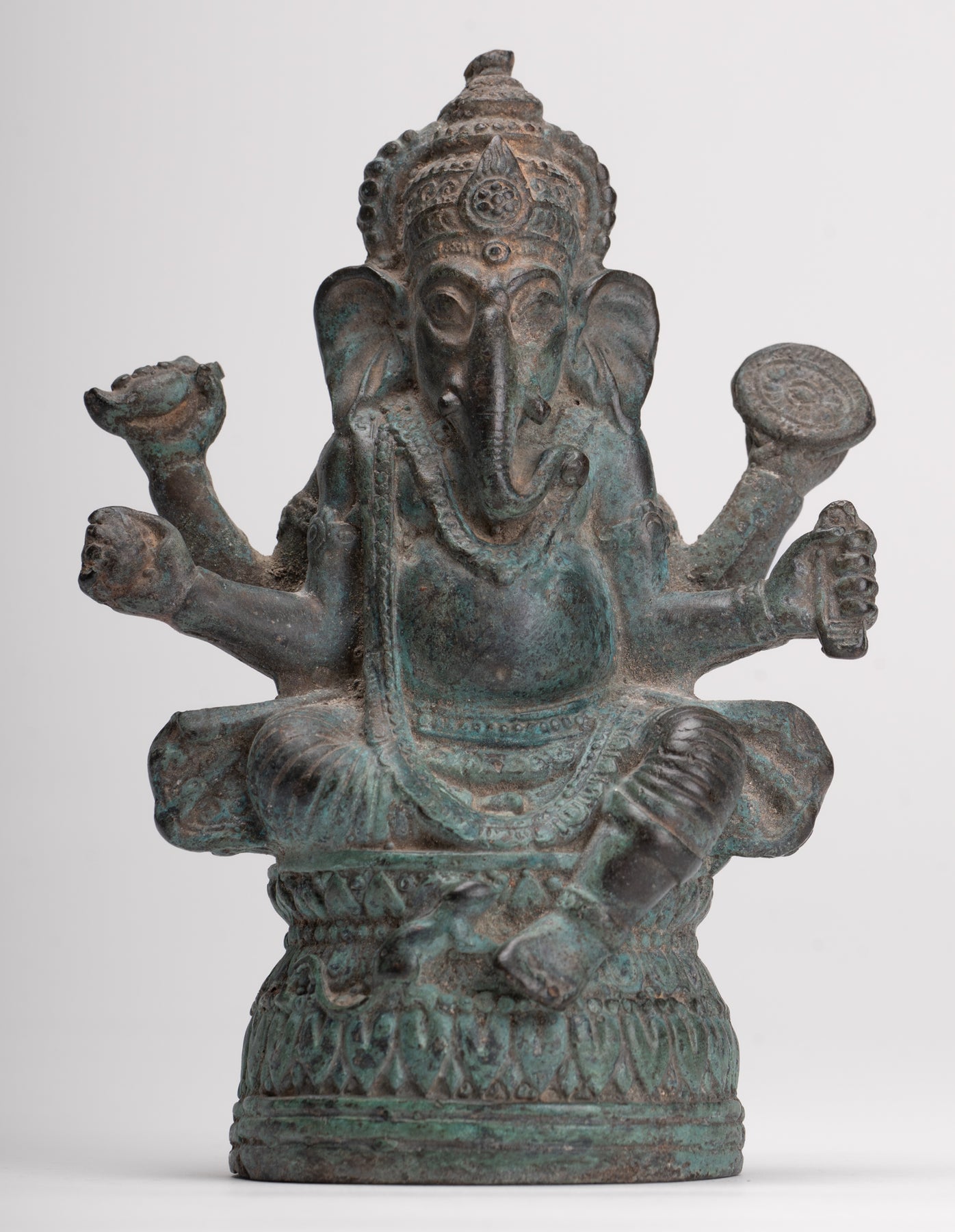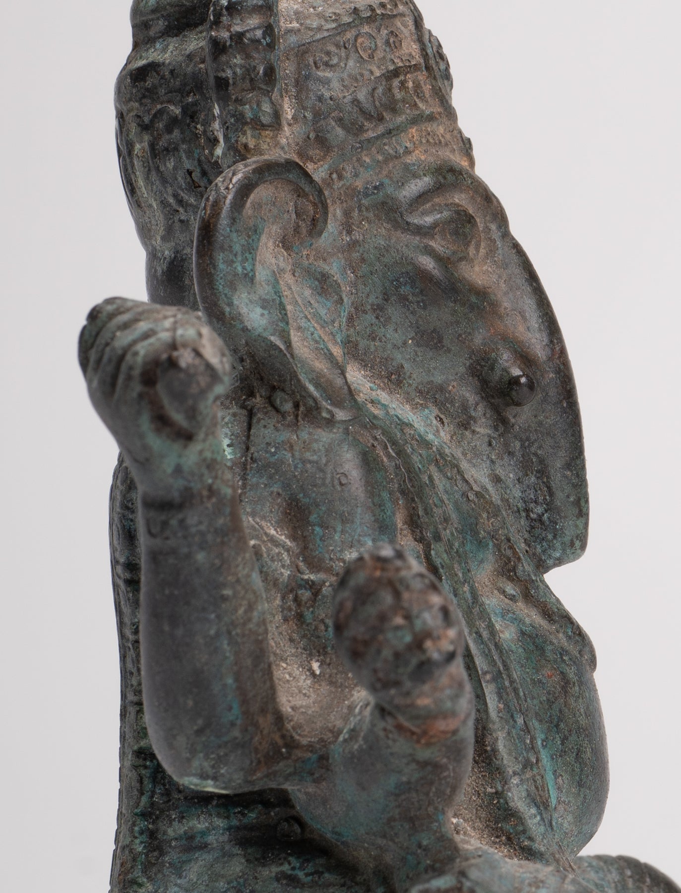 Un reparto expresivo unAntiguo estilo tailandés Ganesha sentado de 4 brazos. El dios con cabeza de elefante lleva un largo dhoti con tela cruzada alrededor de su corpulenta cintura. La pátina distintiva de la pieza es particularmente encantadora.