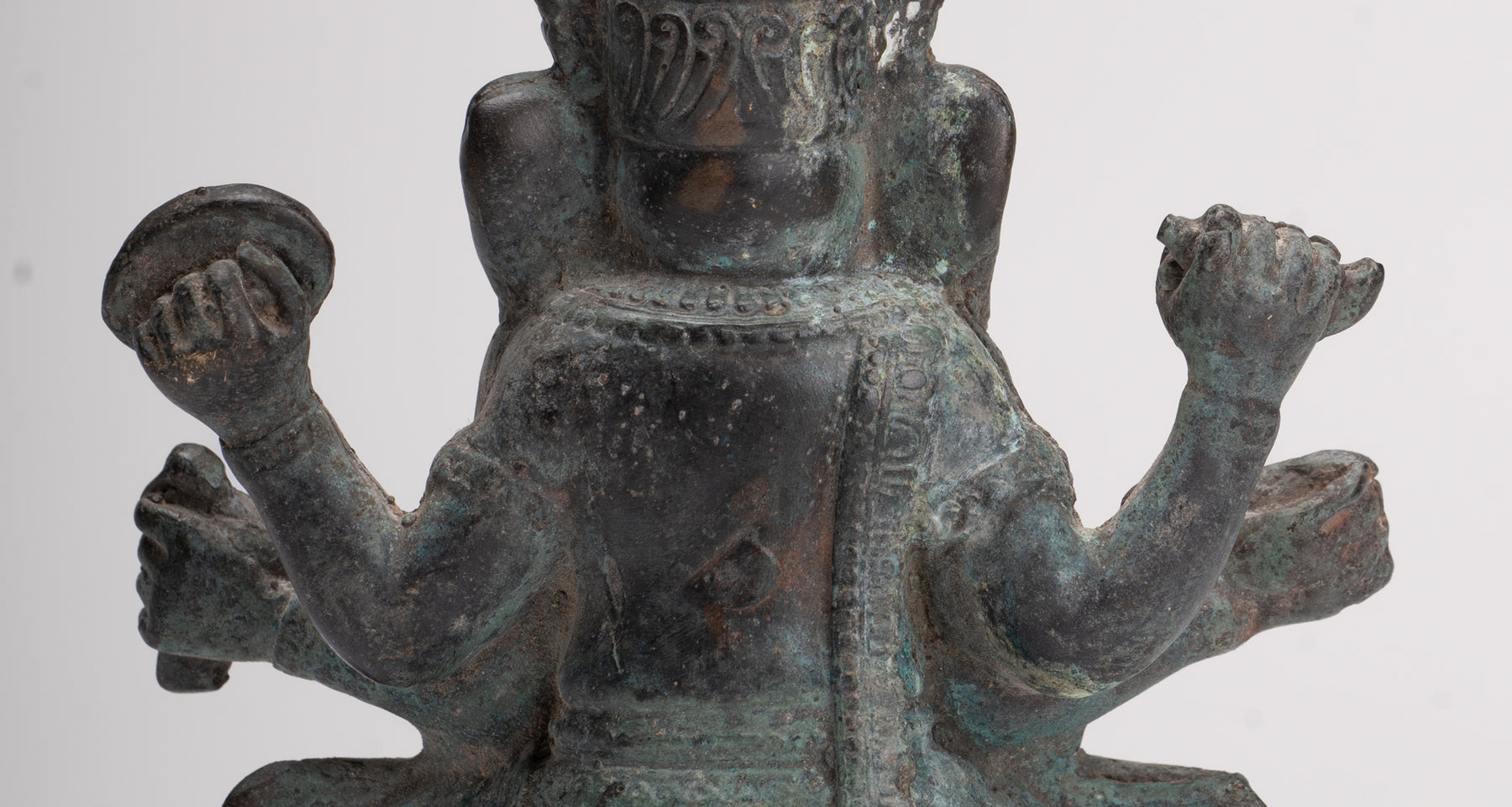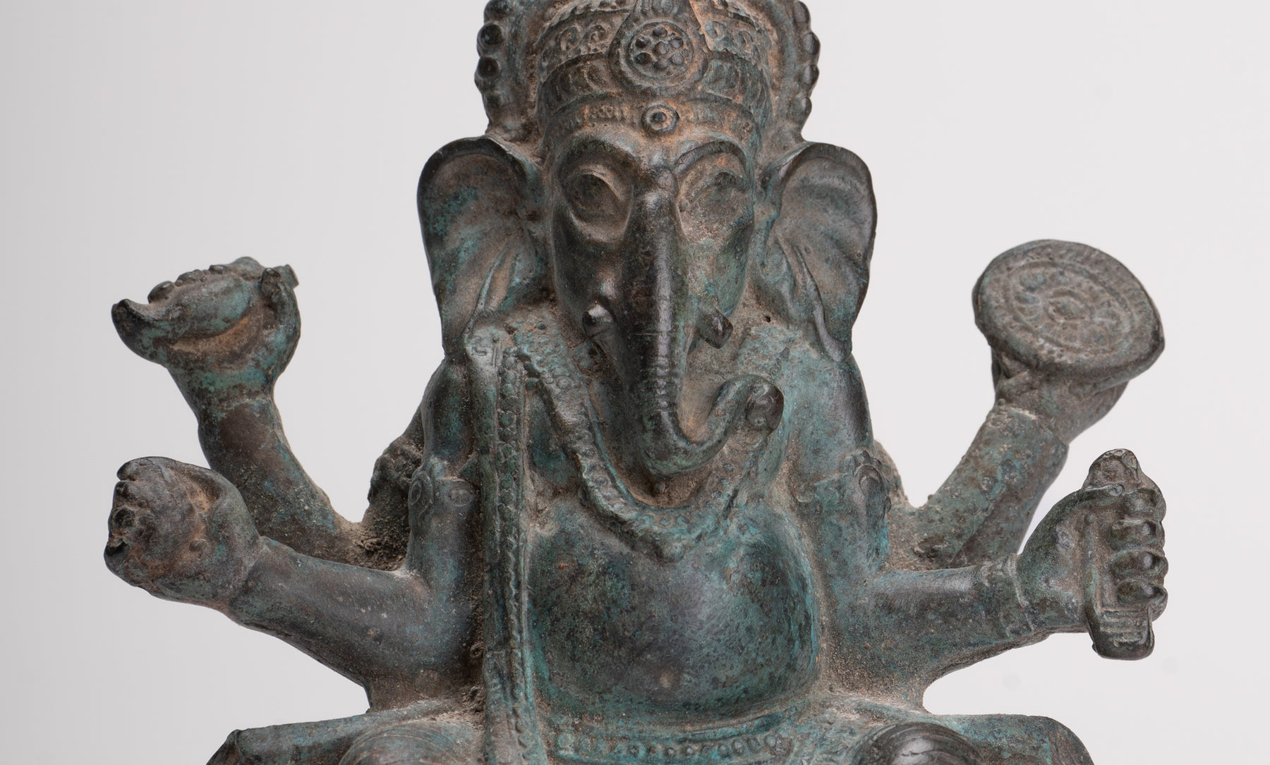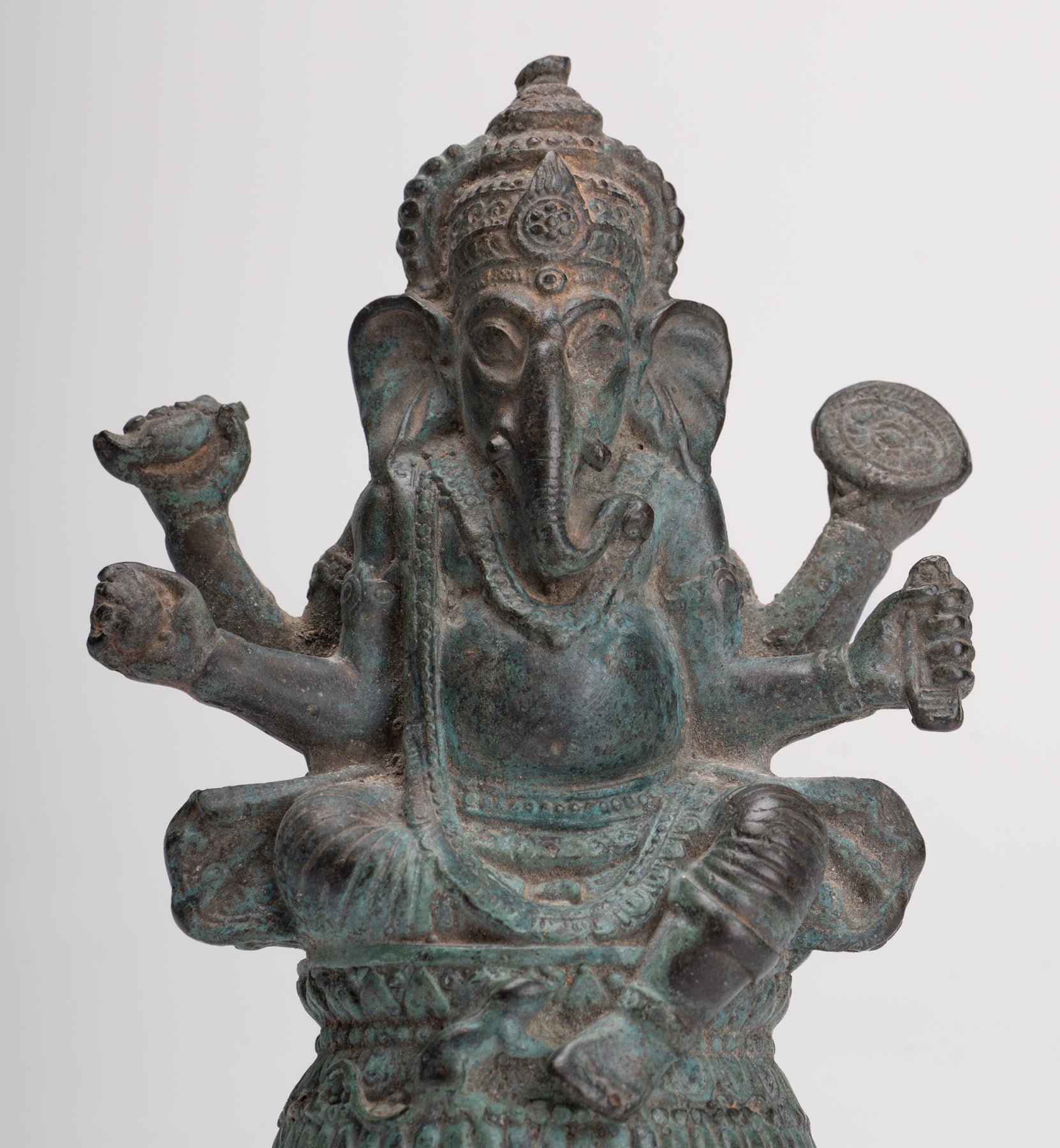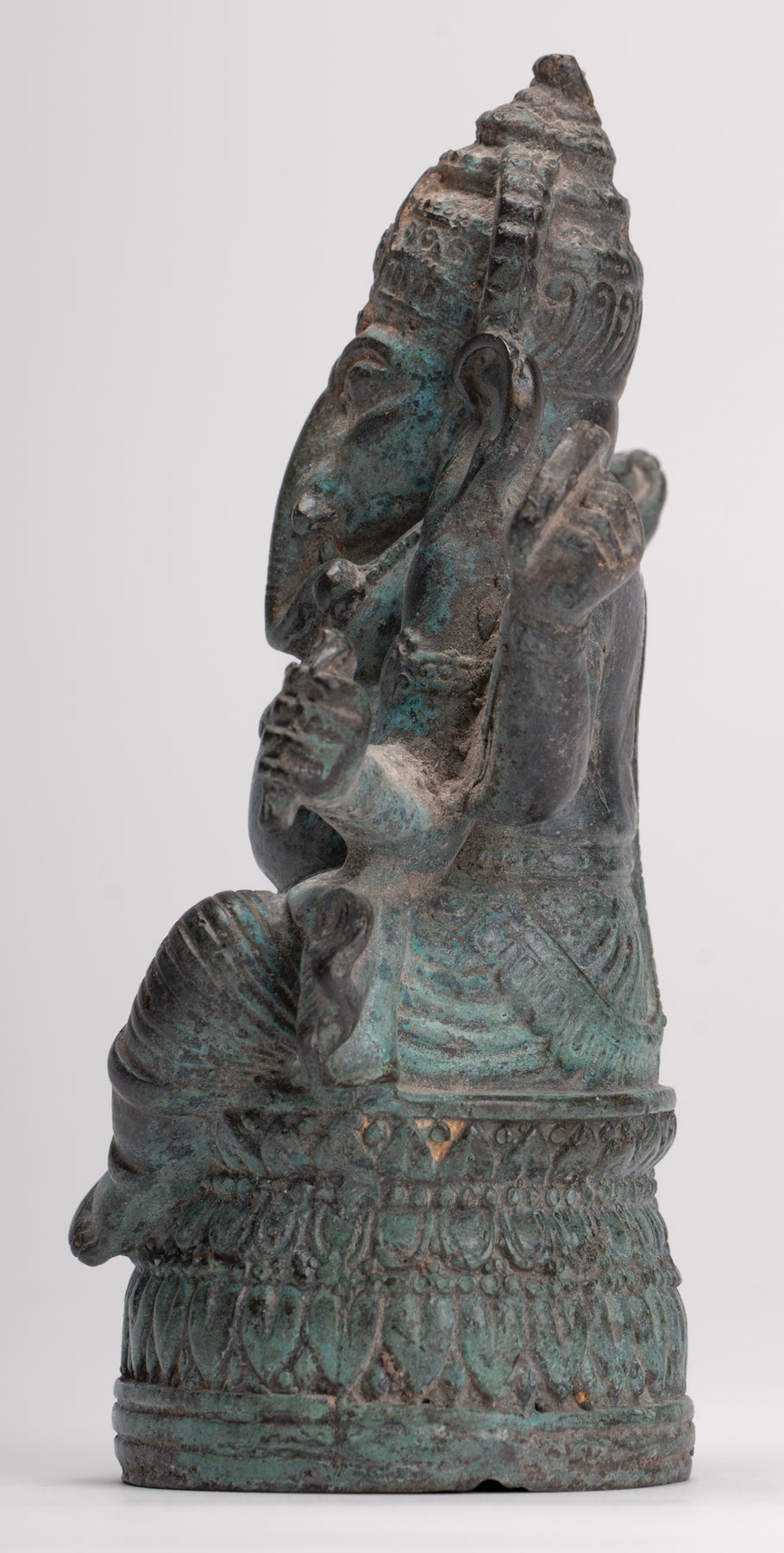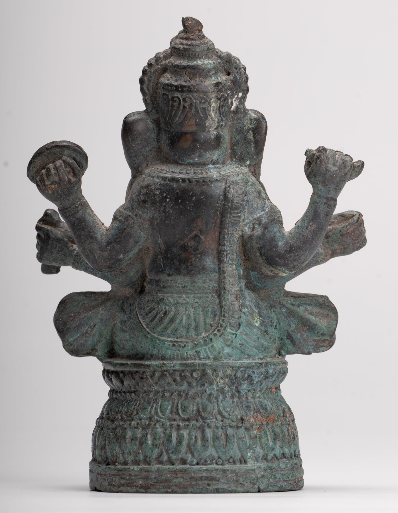 Un reparto expresivo unAntiguo estilo tailandés Ganesha sentado de 4 brazos. El dios con cabeza de elefante lleva un largo dhoti con tela cruzada alrededor de su corpulenta cintura. La pátina distintiva de la pieza es particularmente encantadora.