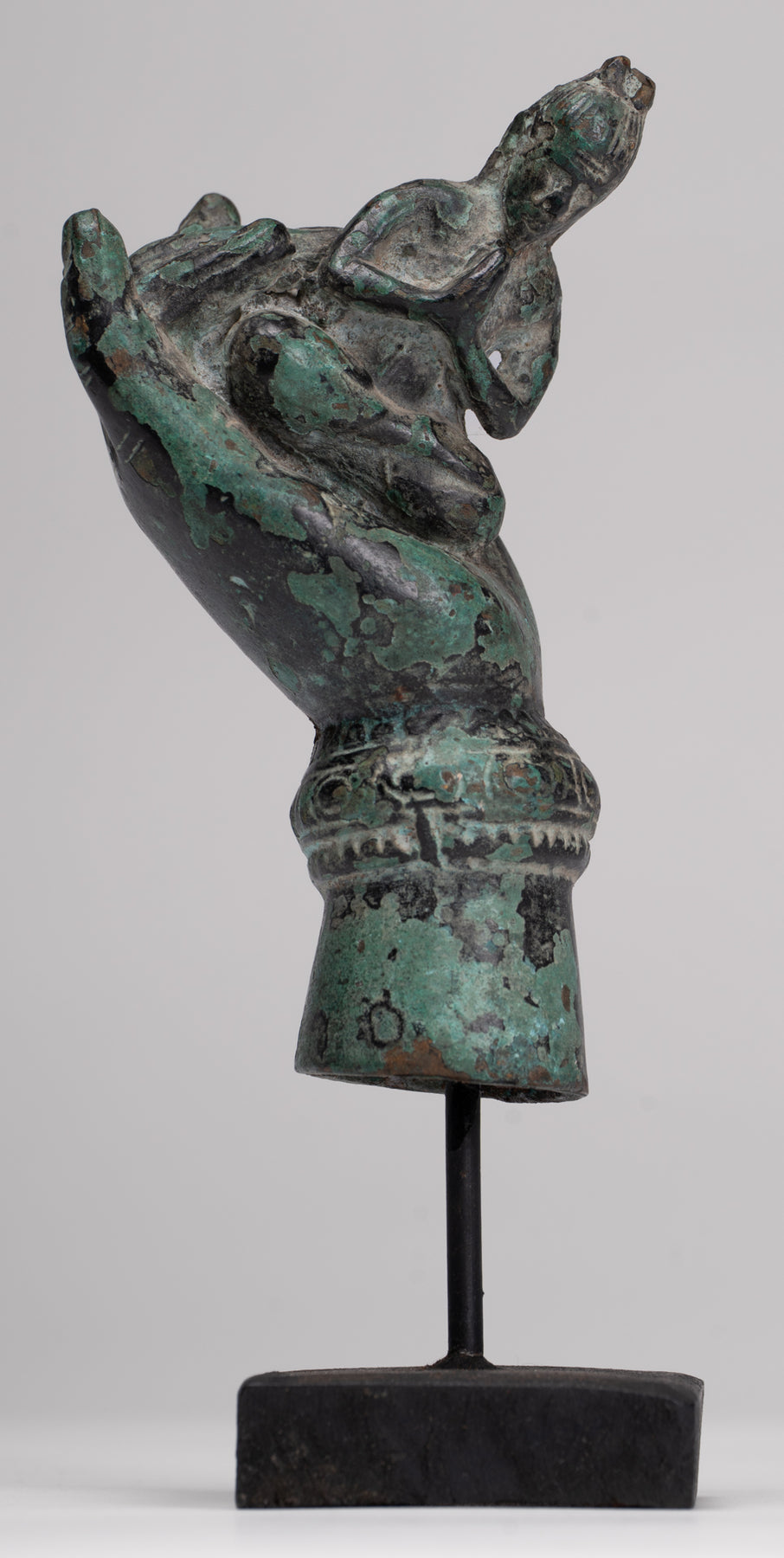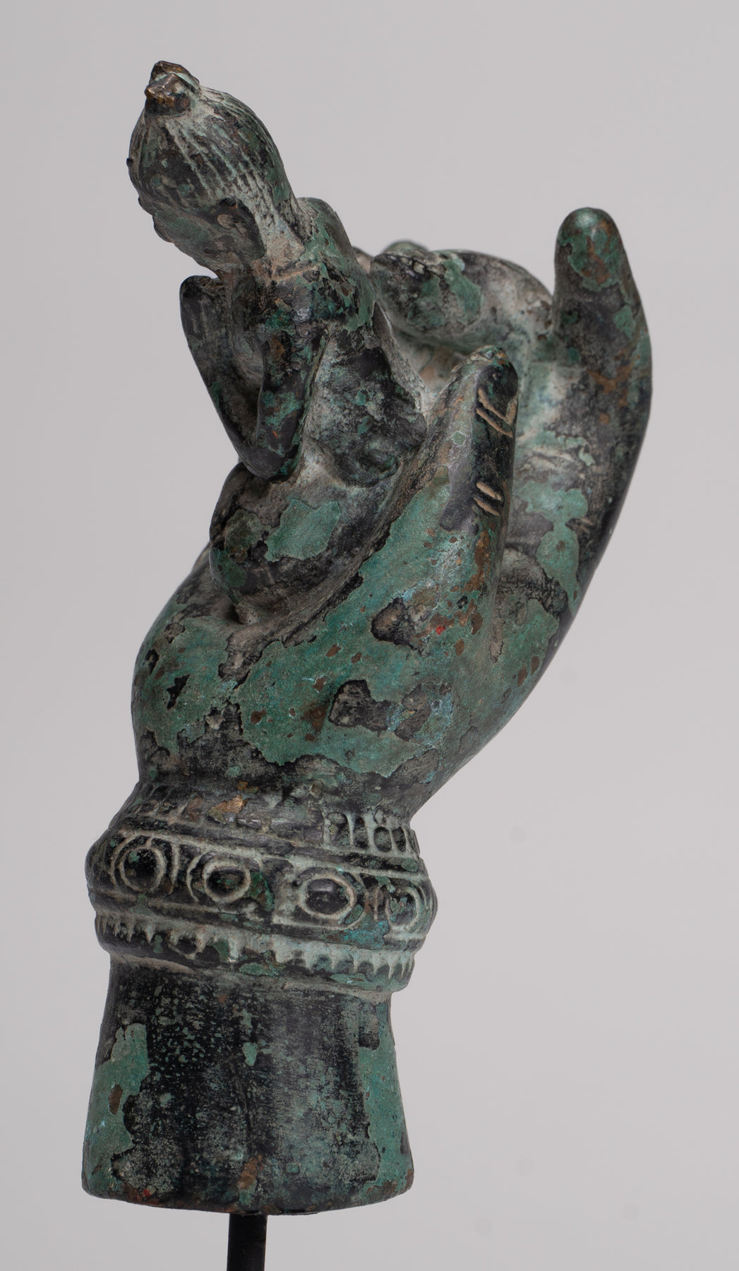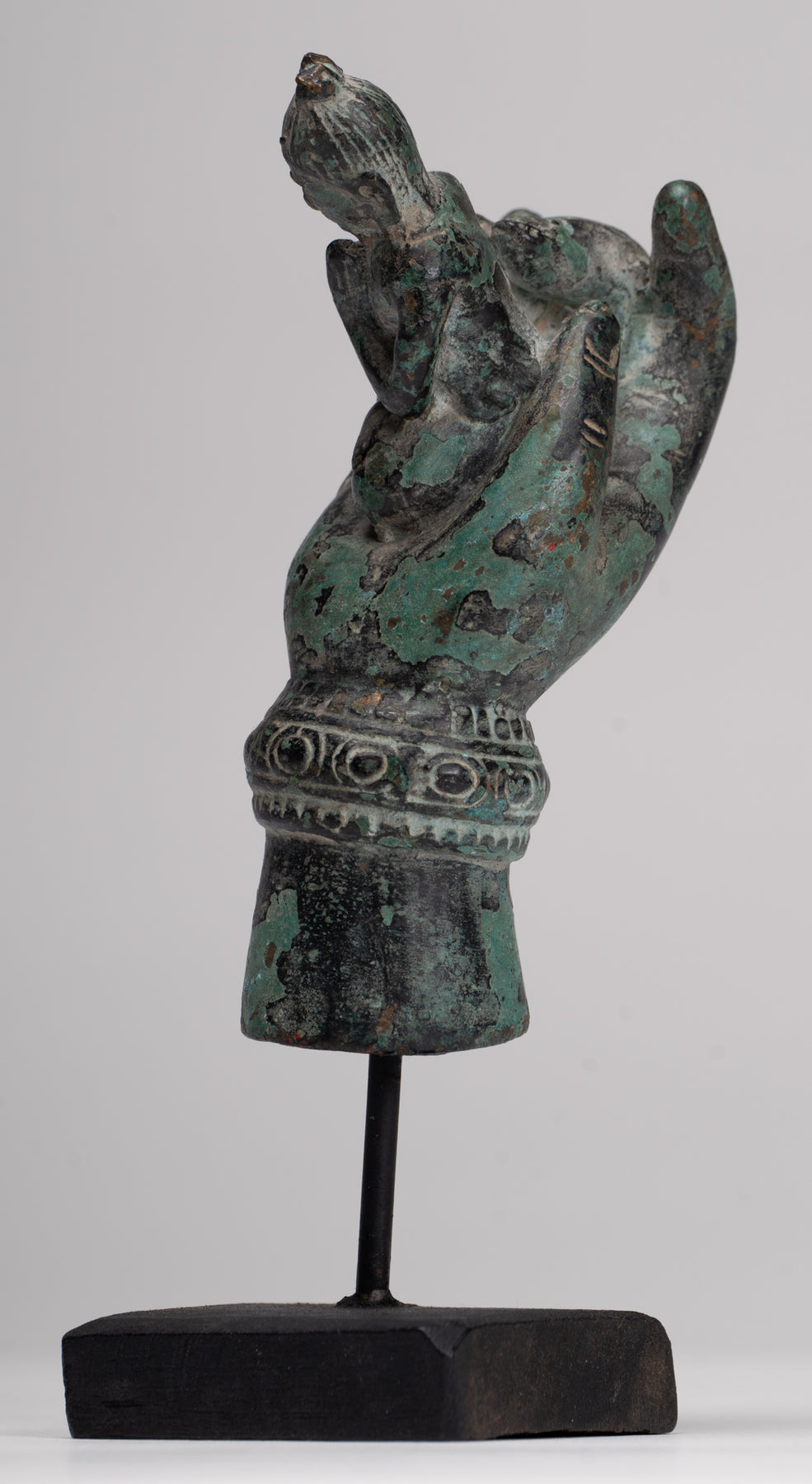 La cara con características sabias está coronada por un tocado cilíndrico adornado con un brote de flores de loto. La flor de loto representa la pureza, la compasión y la entrega de una gran alegría a todos.
