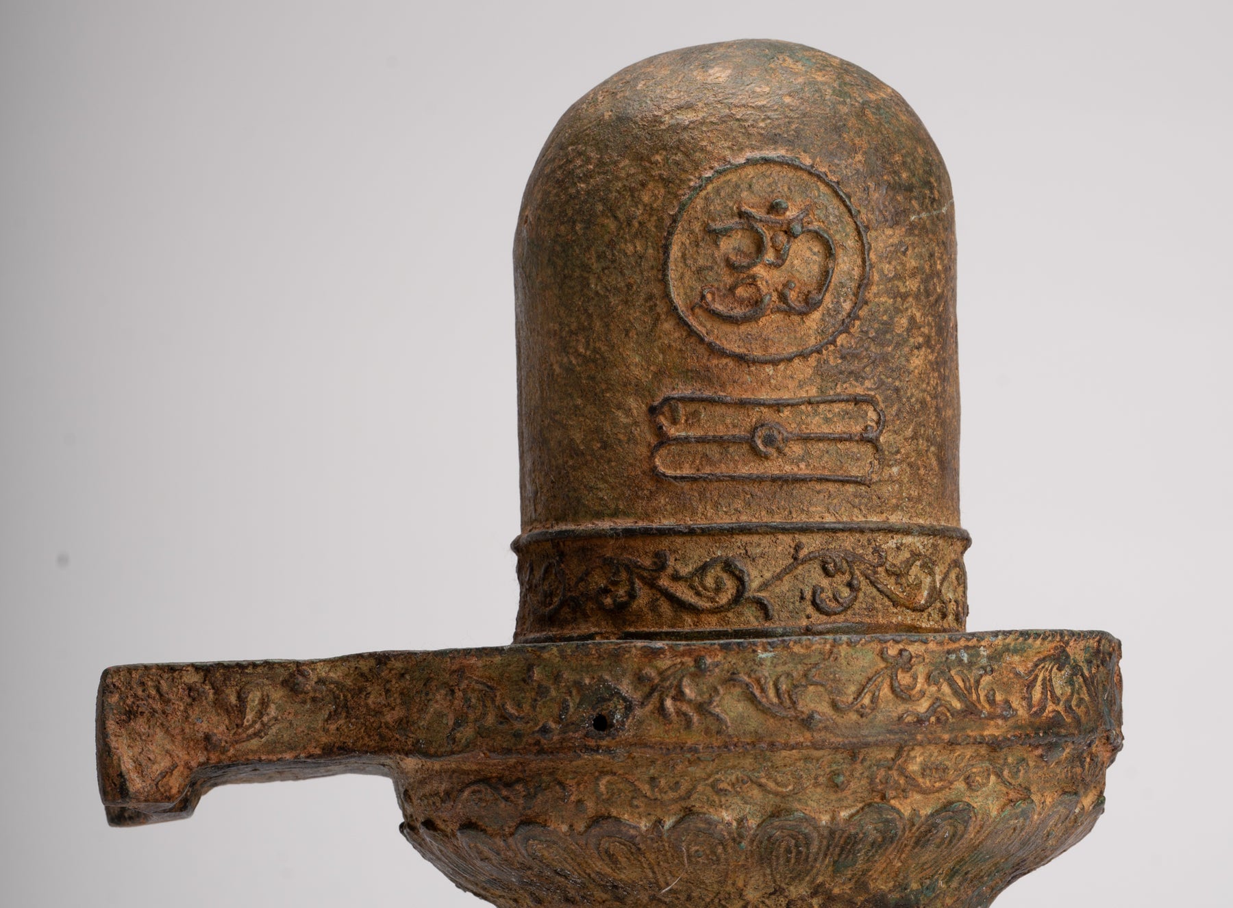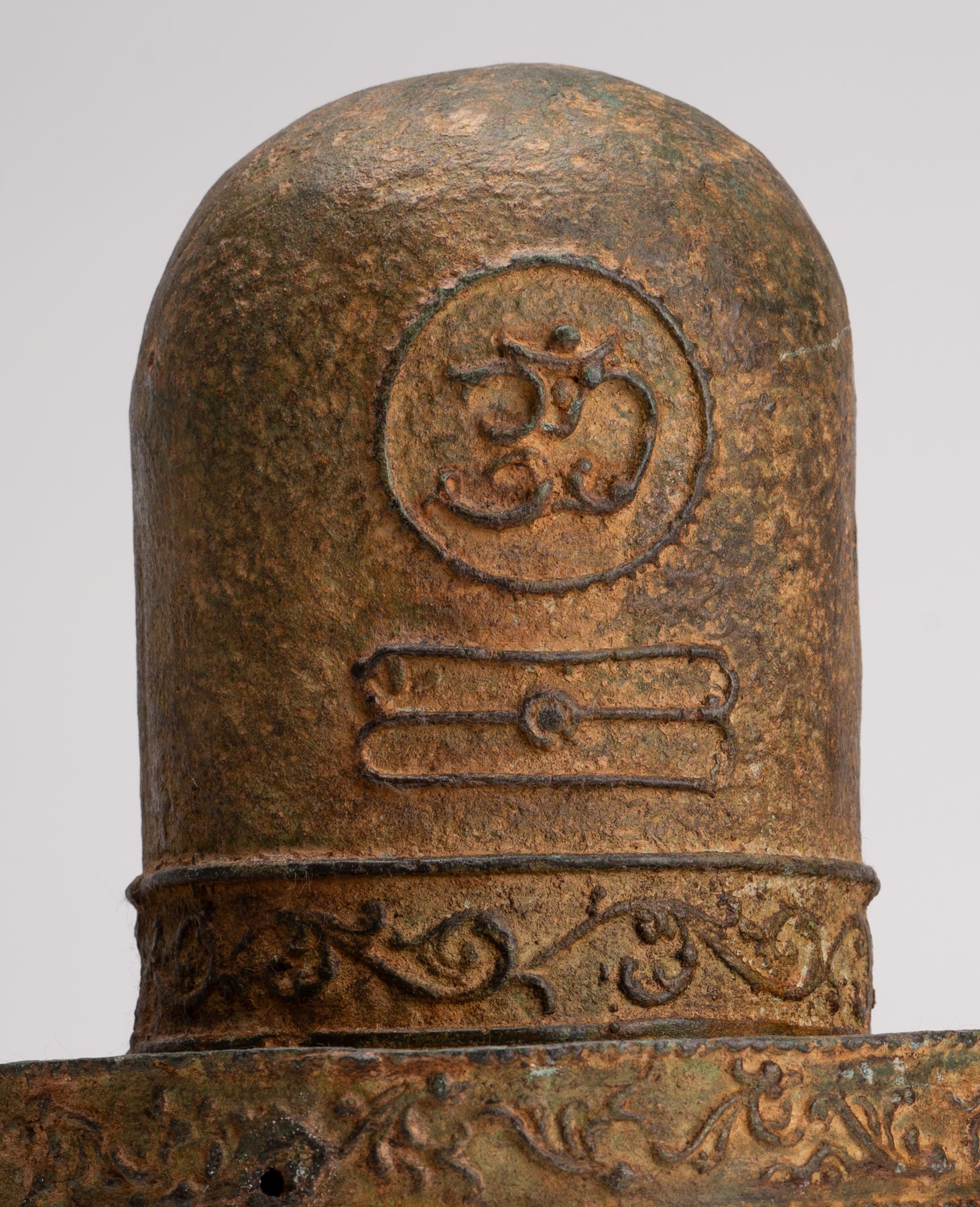 La Linga también está decorada con el símbolo OM. El símbolo OM que representa un sonido sagrado, sílaba, mantra e invocación en el hinduismo. Se dice que es la esencia del absoluto supremo, la conciencia del mundo cósmico.