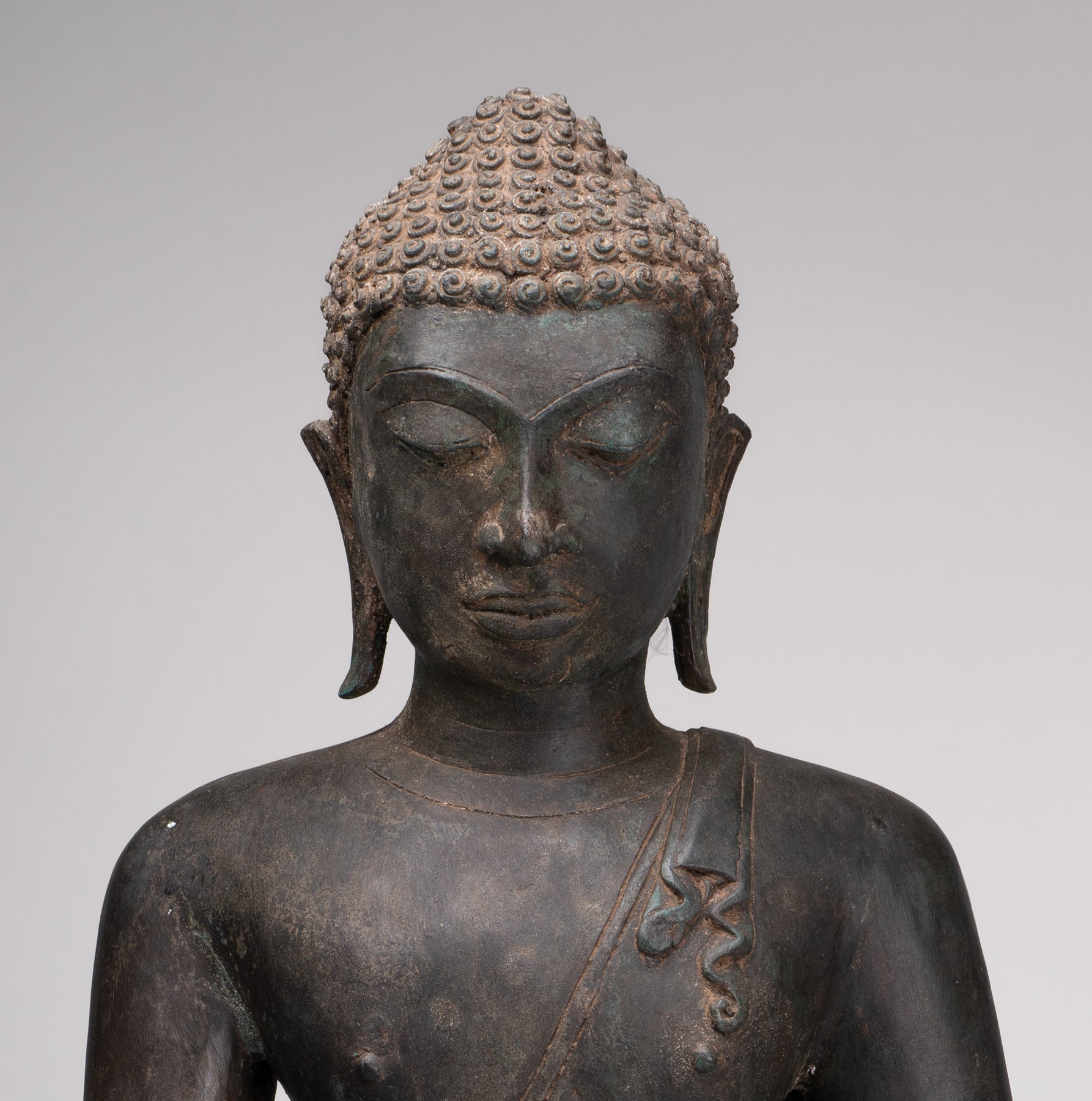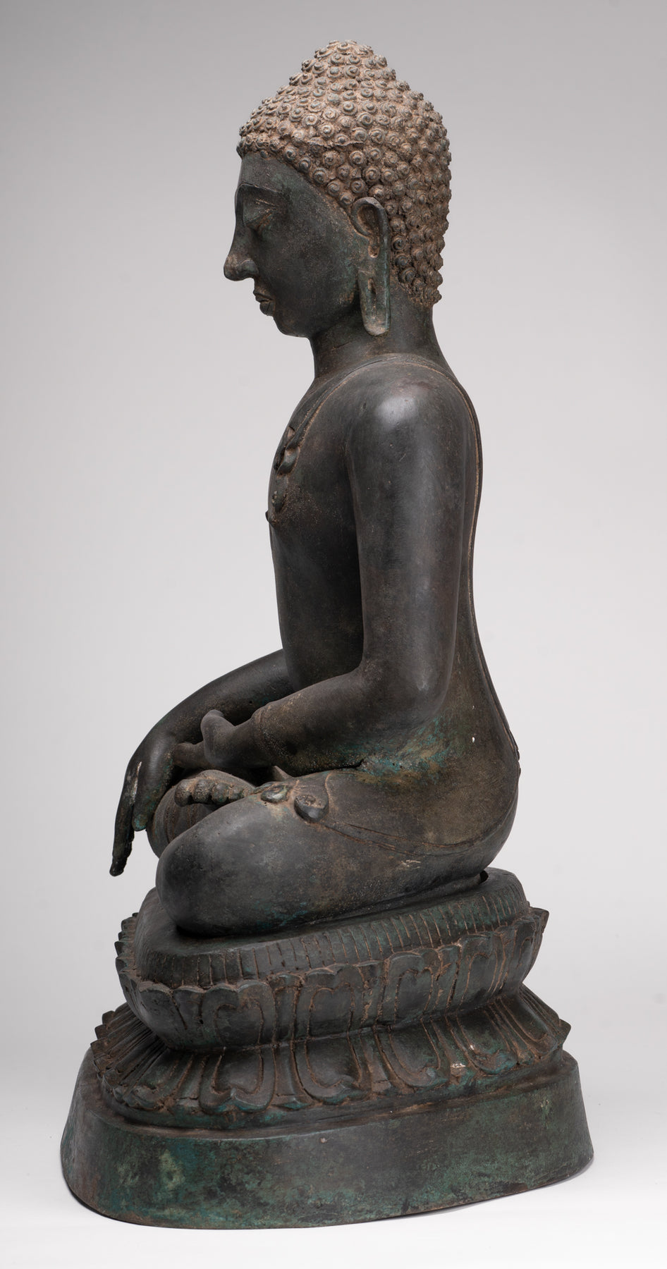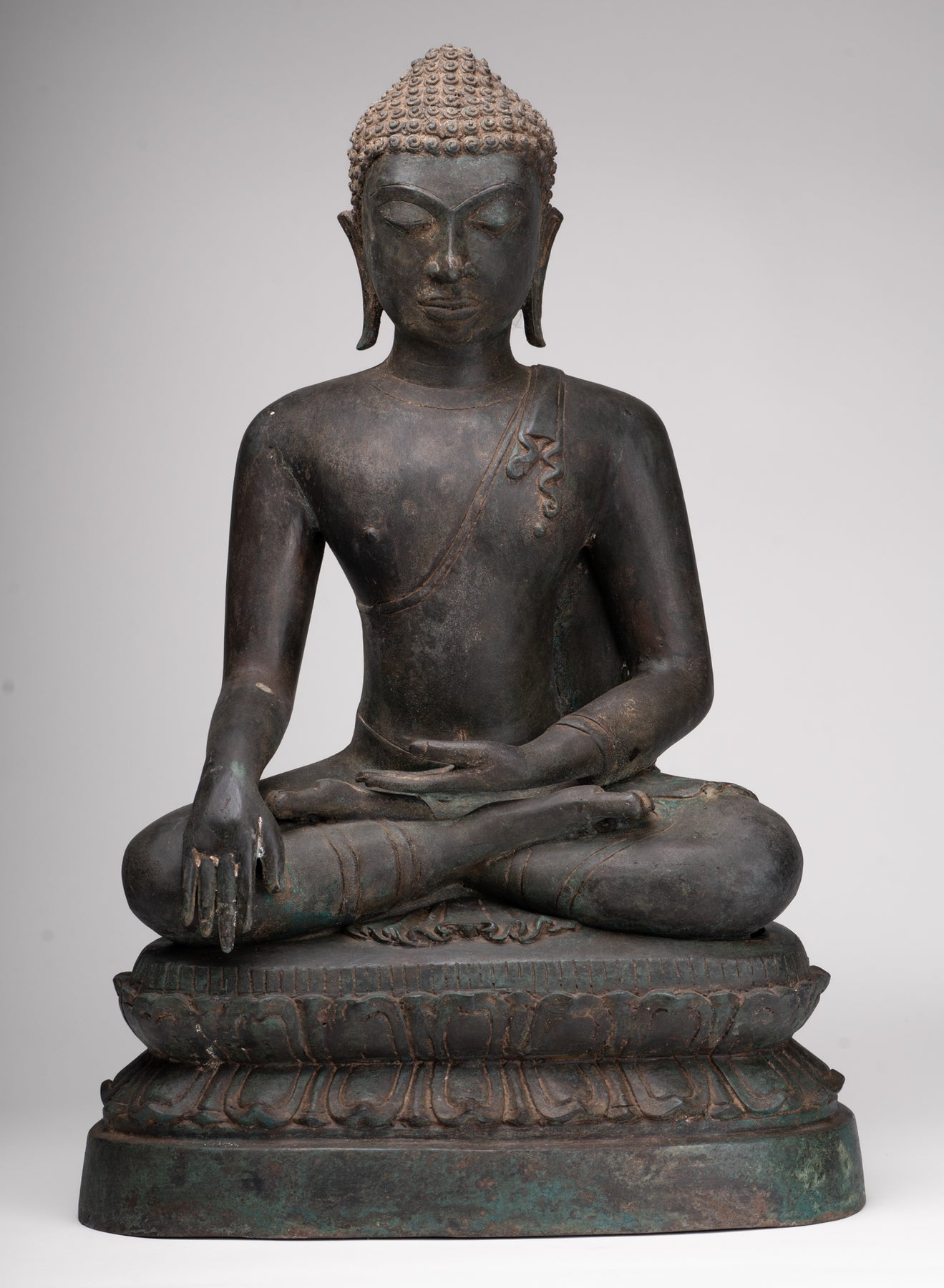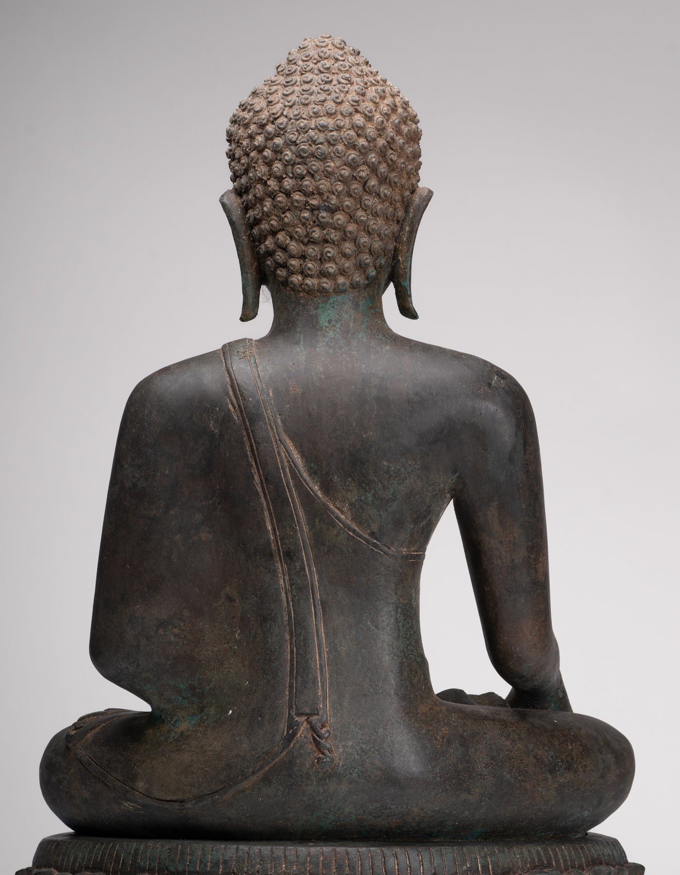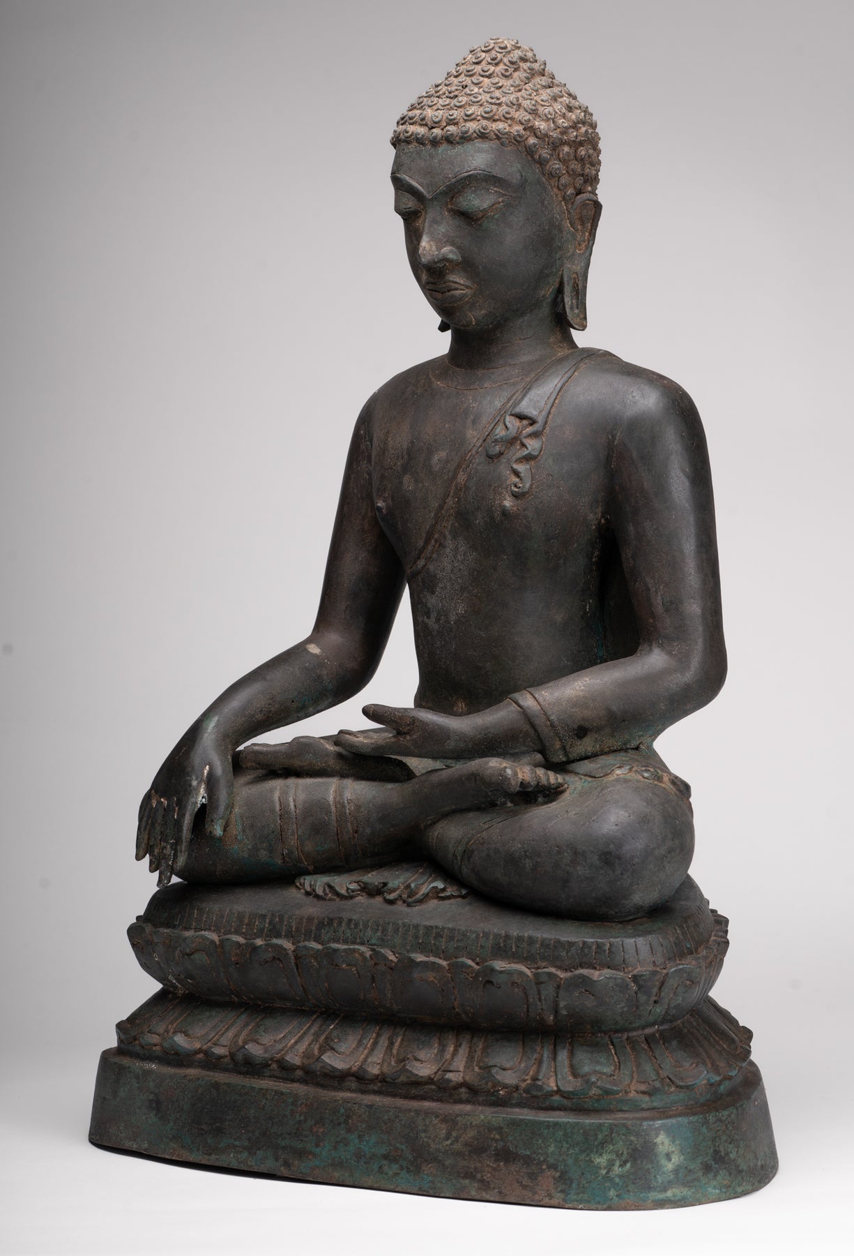 Un impressionante Buddha dell'Illuminazione in bronzo in stile Srivijaya alto 63 cm/25 pollici quello è un esempio lampante dell'arte sacra del sud-est asiatico portata in un ambiente contemporaneo. Fuso in due pezzi e seduto nella classica postura dell'illuminazione, ha l'autorità silenziosa e la presenza che ti aspetteresti da un'immagine del tempio piuttosto che da un semplice oggetto decorativo.