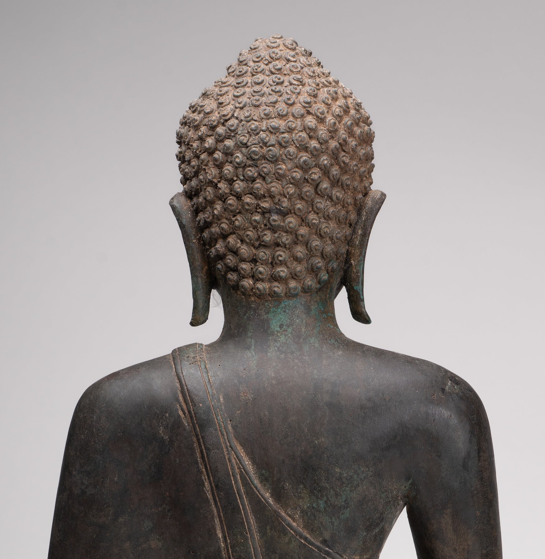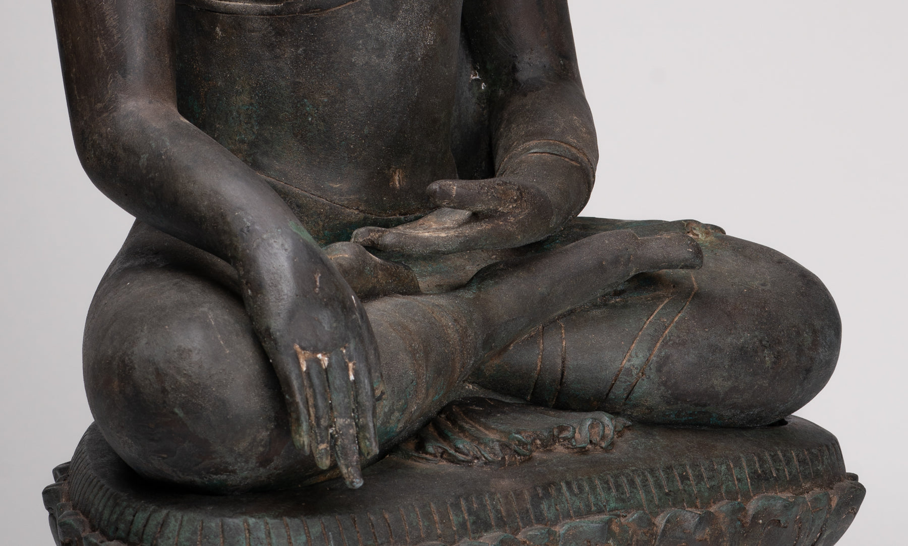 Questo Buddha dell'Illuminazione in bronzo cattura lo stesso senso di equilibrio e chiarezza spirituale, riecheggiando l'estetica duratura di una delle grandi culture buddiste del sud-est asiatico.