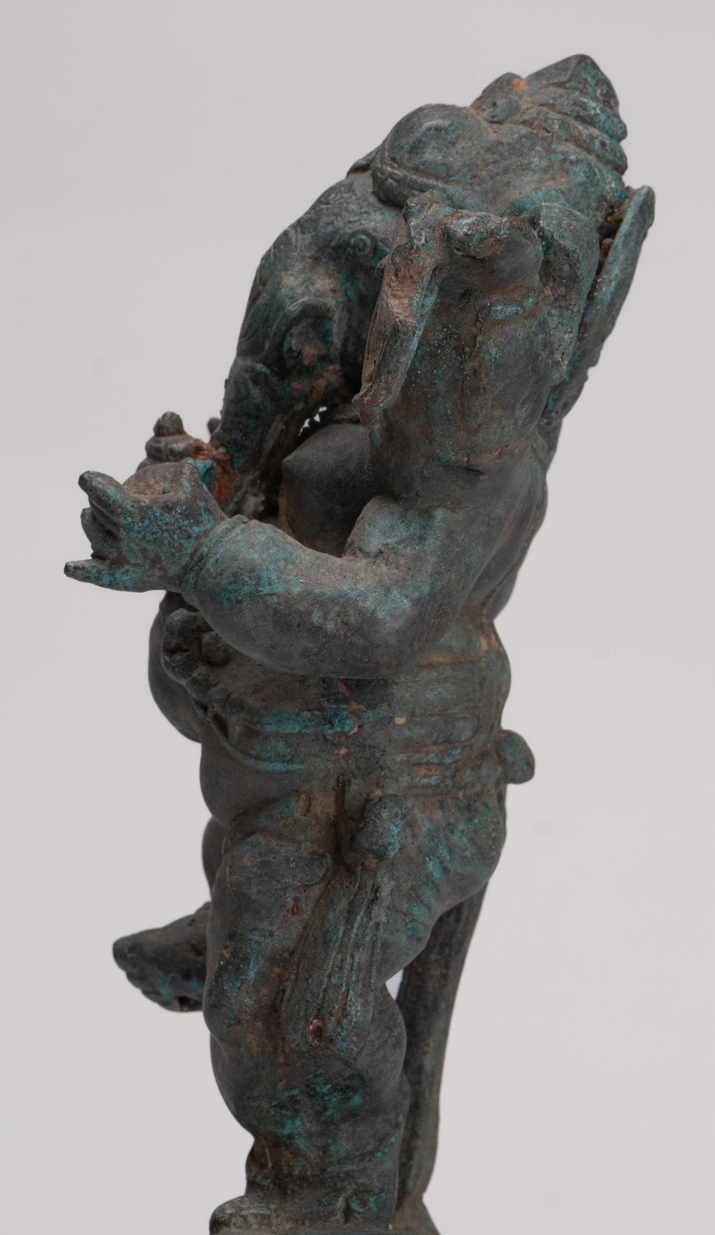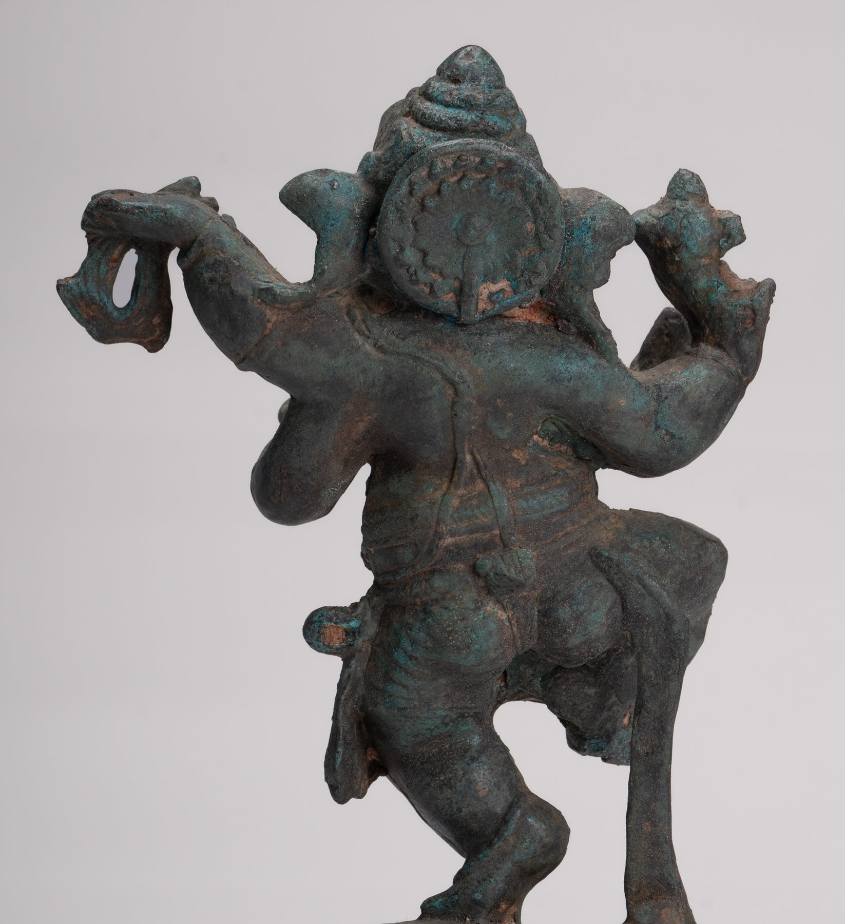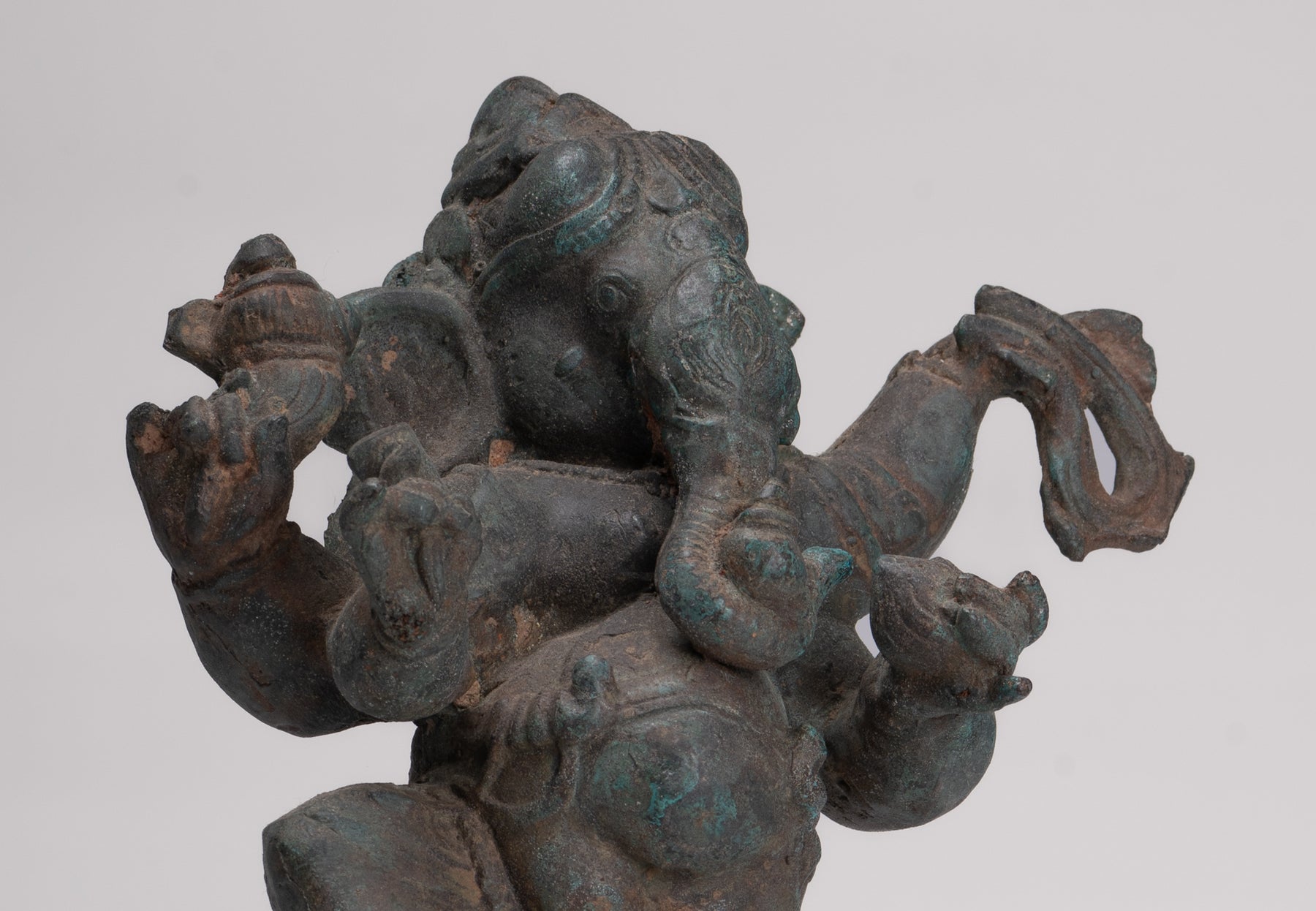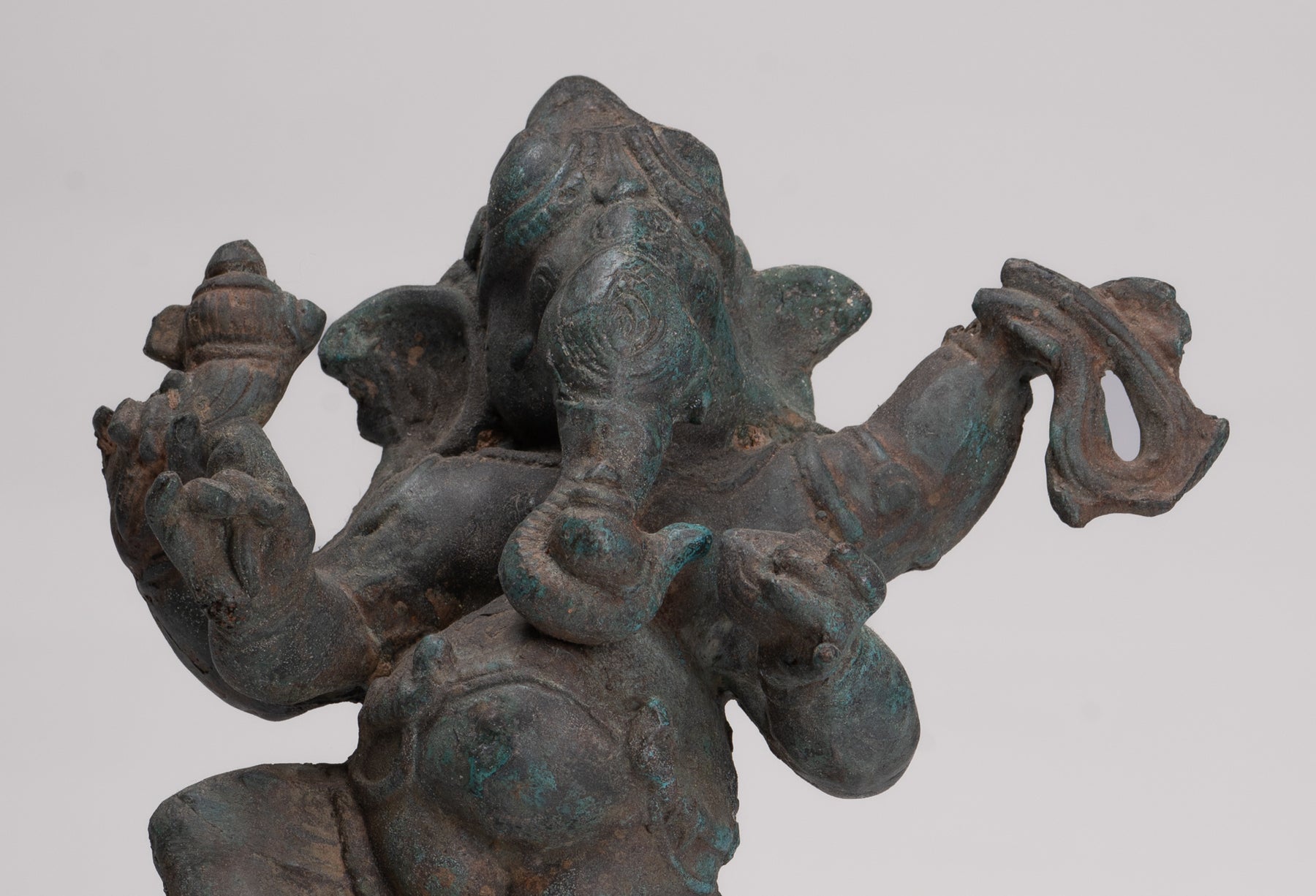 La patina distintiva del pezzo è particolarmente deliziosa. Ganesha è il figlio di Shiva. Tiene la zanna rotta in una mano, conchiglia conchiglie, laddus o dolci e un cappio nelle altre sue mani.