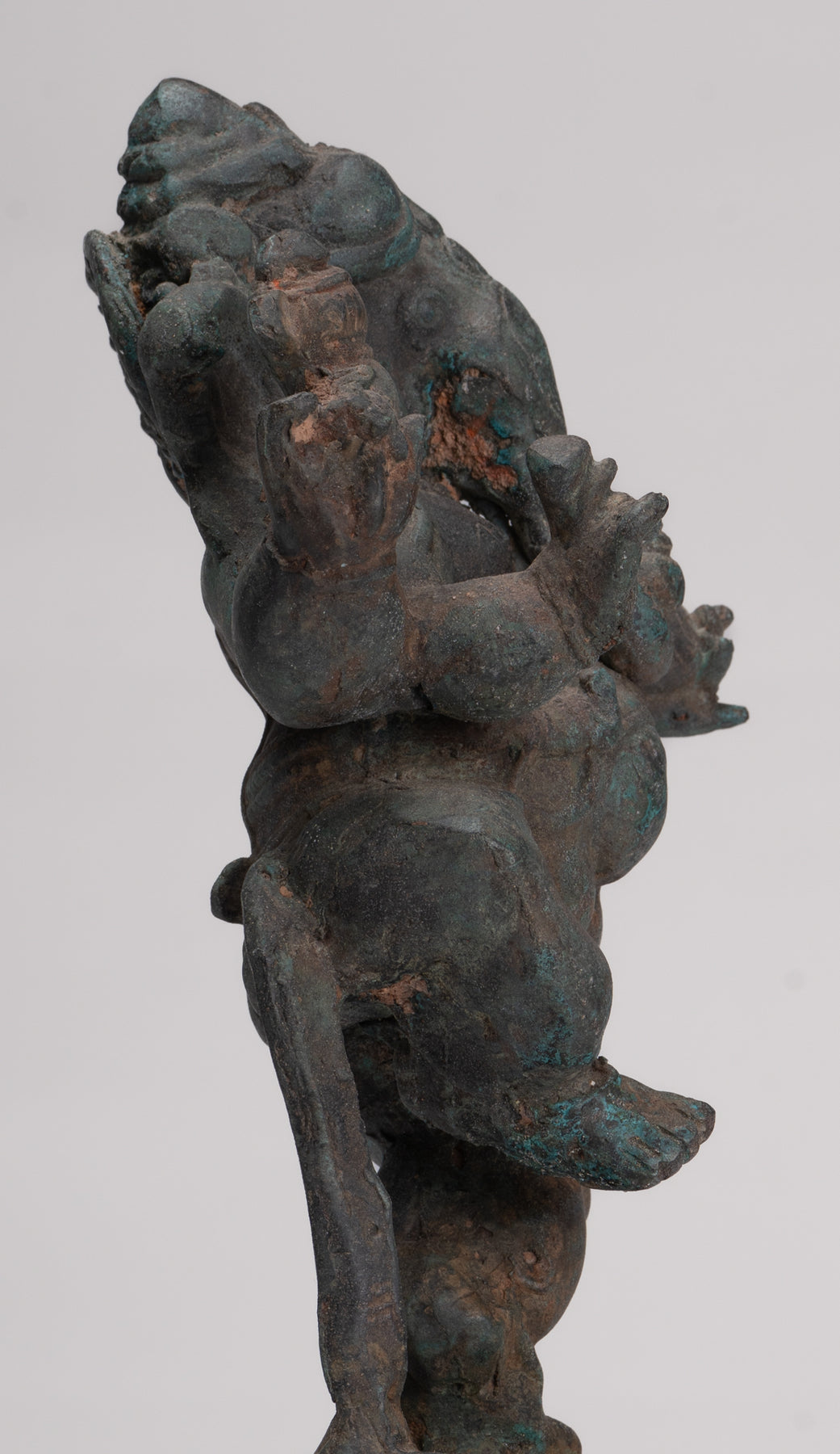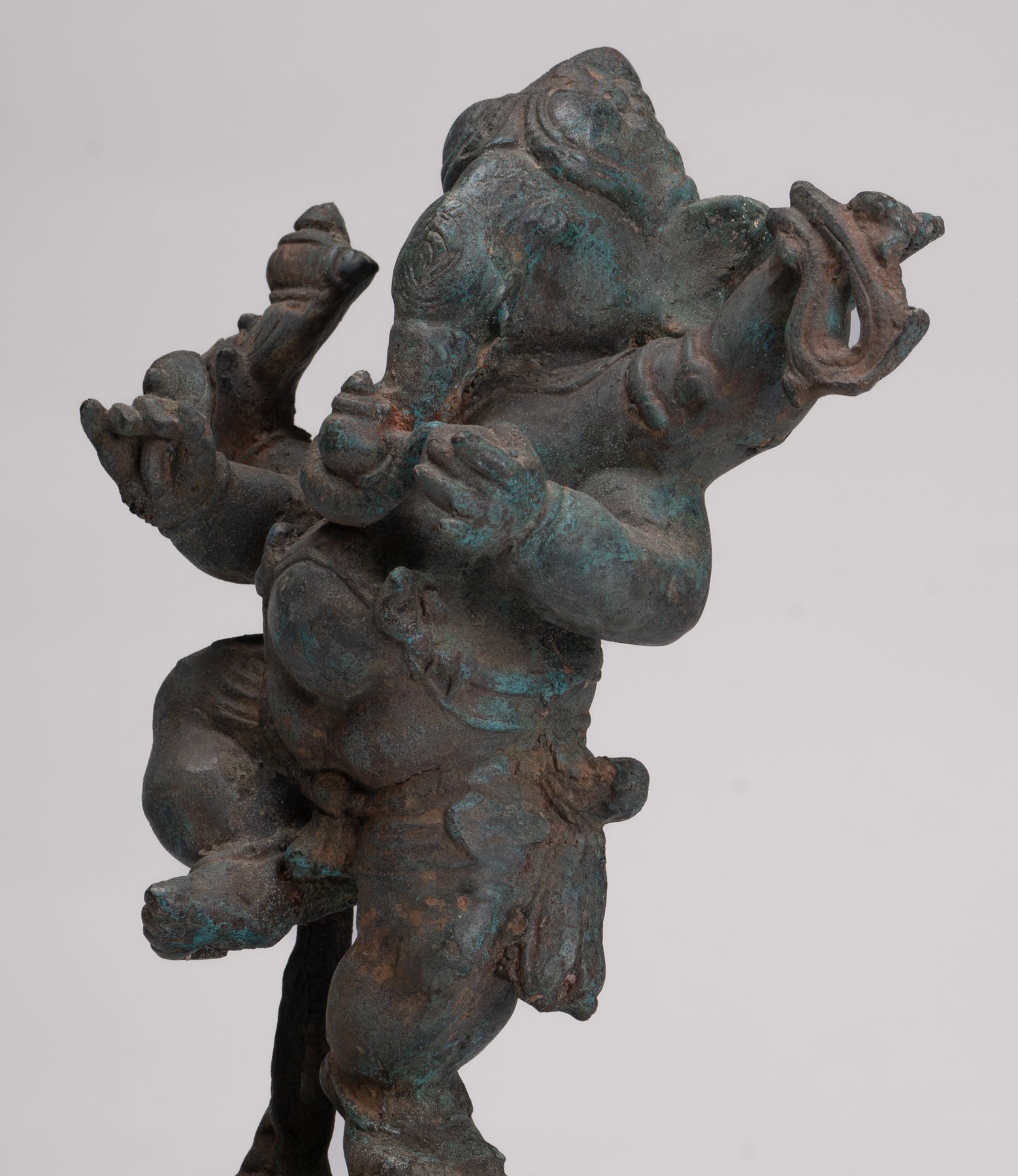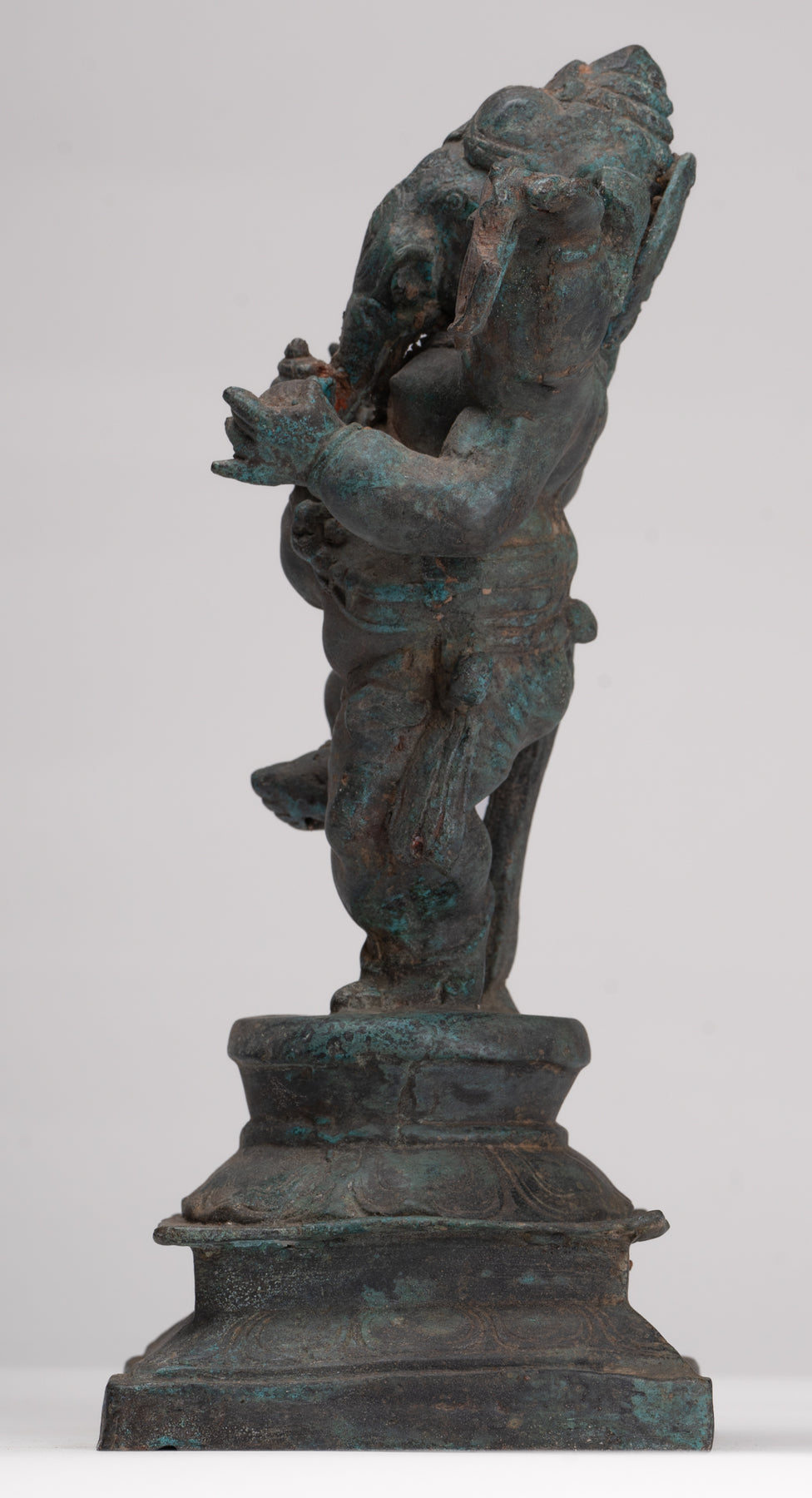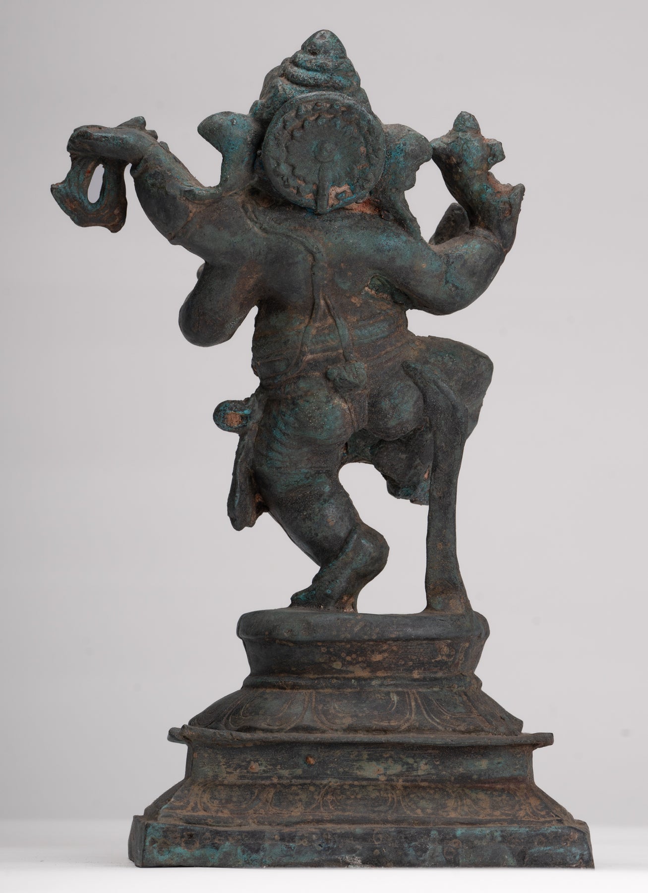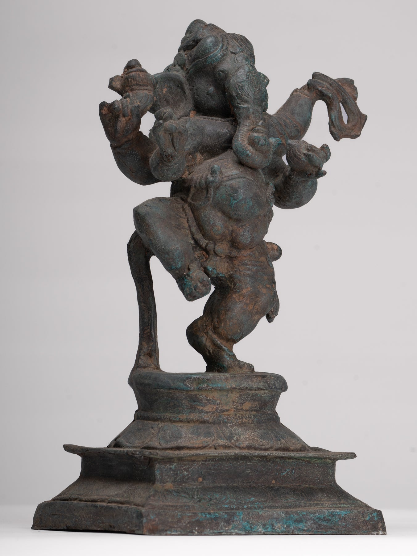 Un cast espressamente Antico stile tailandese danzante ganesha In piedi su un bastone di foglie di loto circolare, che è di per sé impostato su un piedistallo quadrato. Il dio dalla testa di elefante indossa un dhoti corto con stoffa incrociata attorno alla sua vita portuale