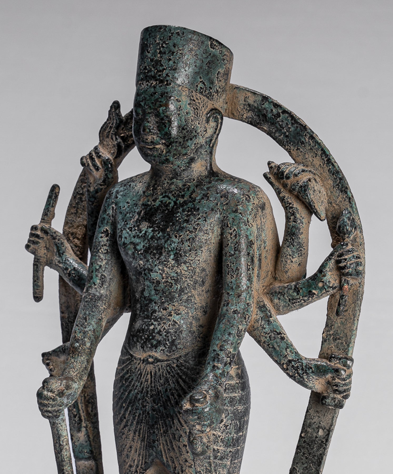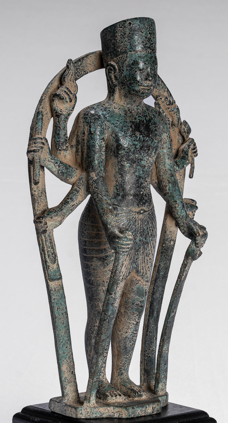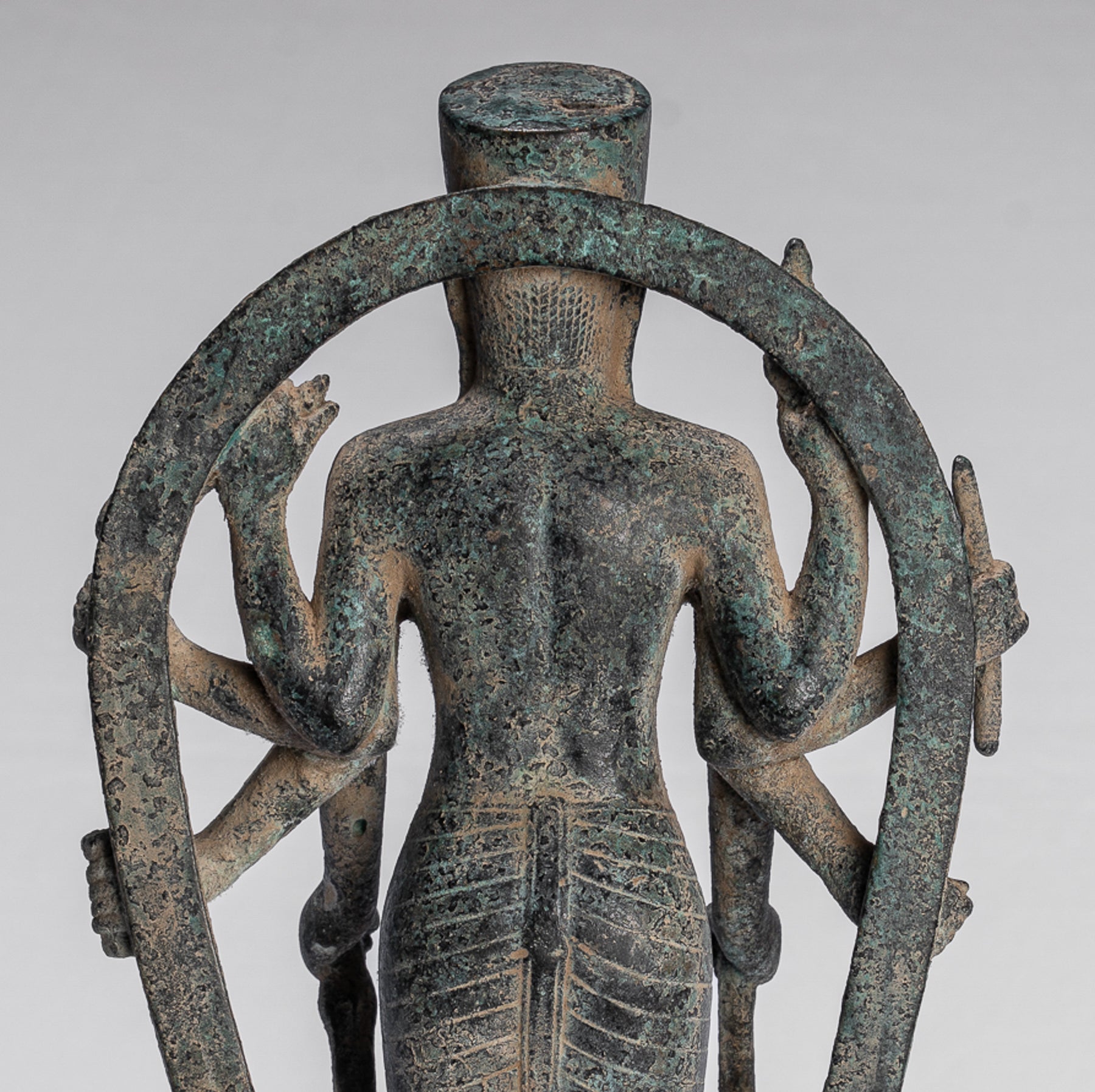 Un antico stile Khmer in piedi in bronzo 8 braccio Vishnu Sculpture. Vishnu è sia il protettore del mondo che il conservatore, restauratore di ordine morale: è onnipotente e onnicomprensivo per natura.