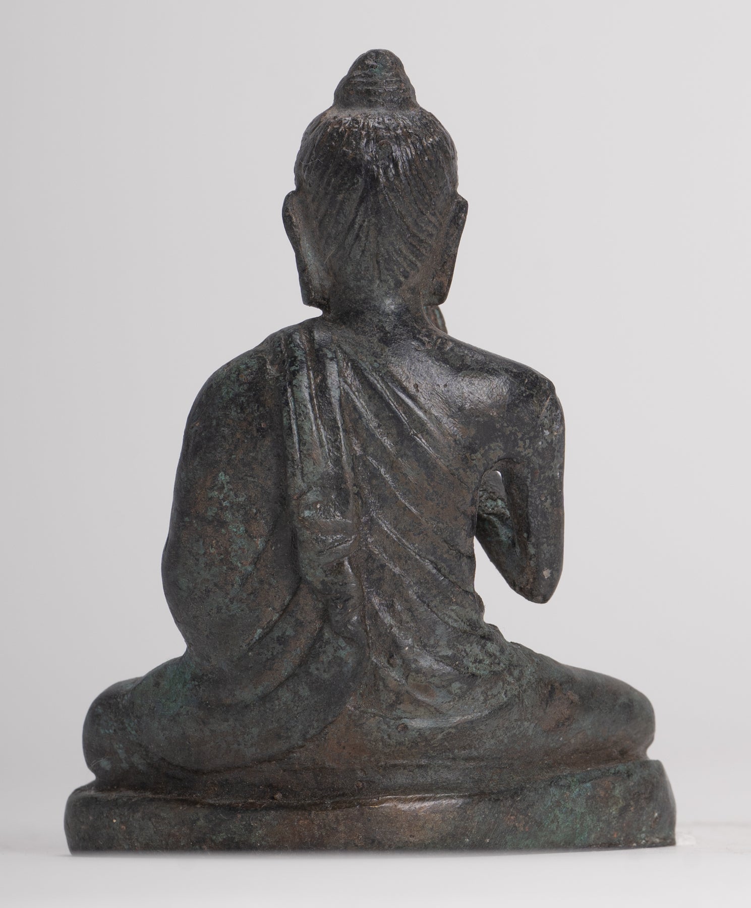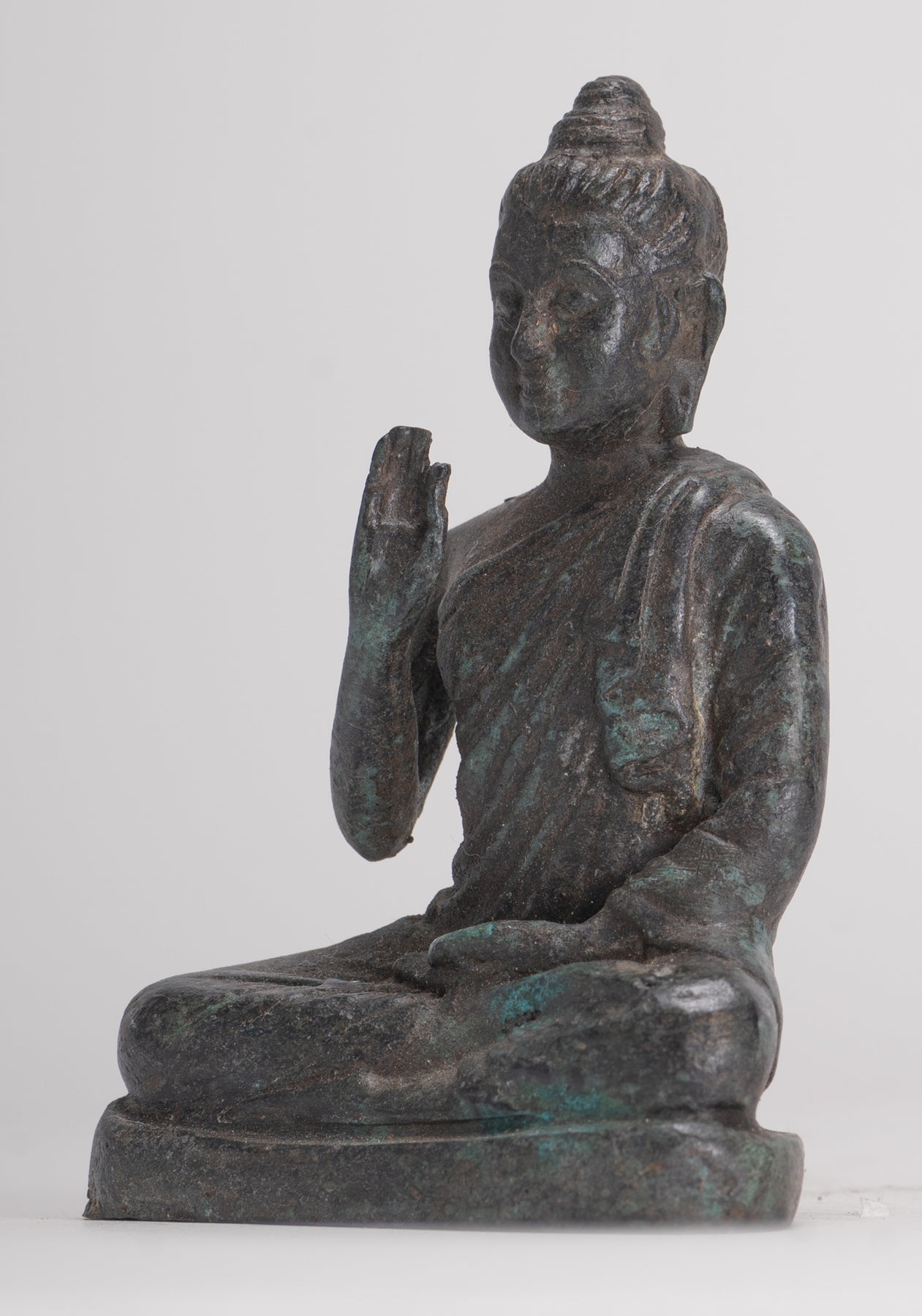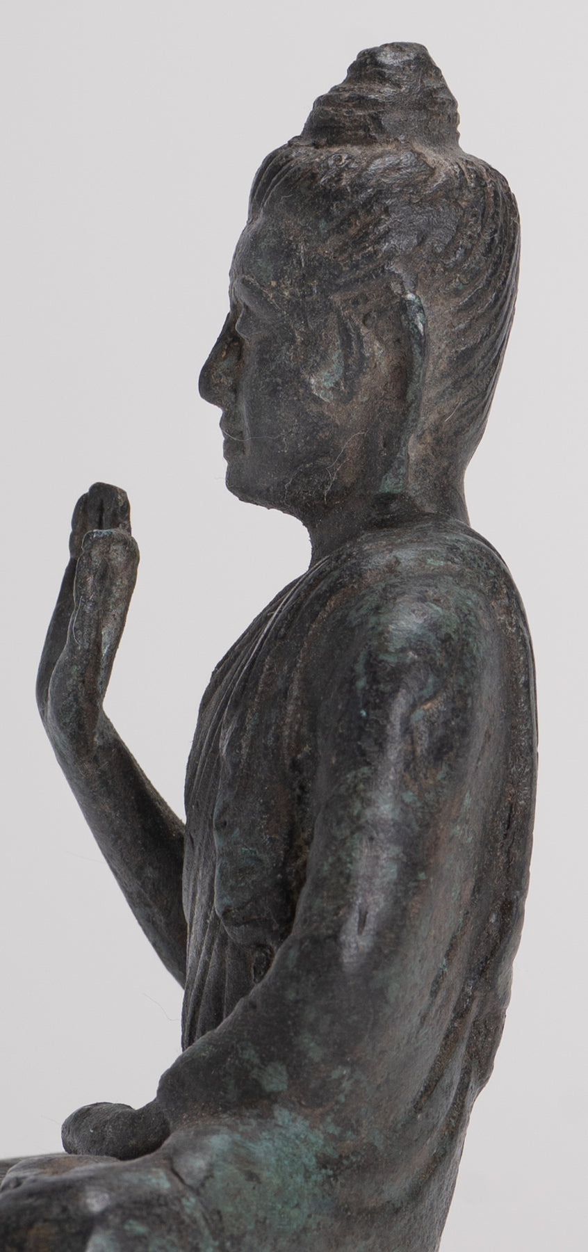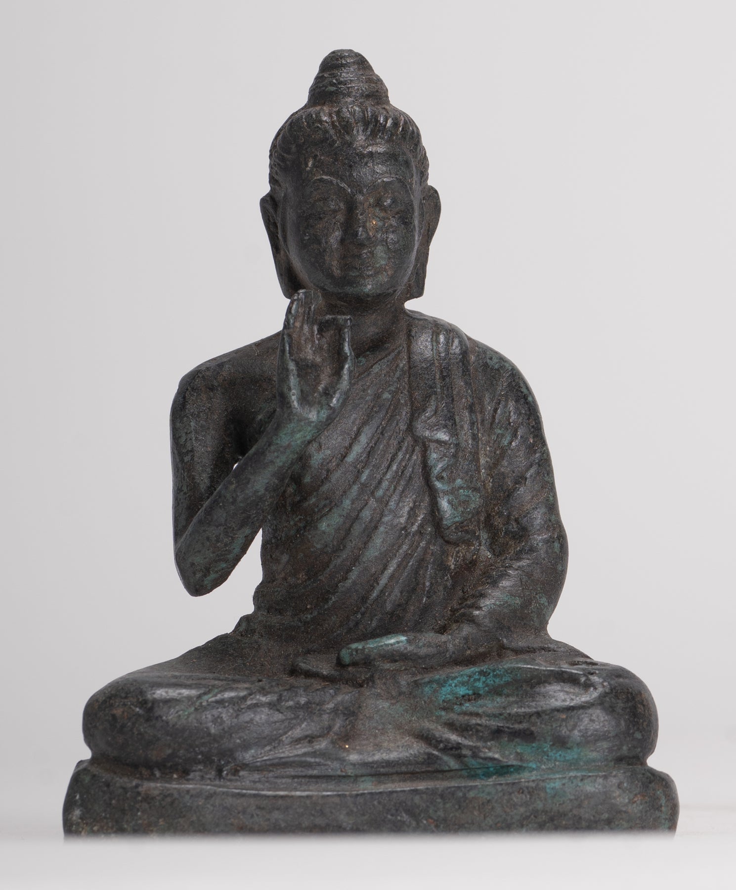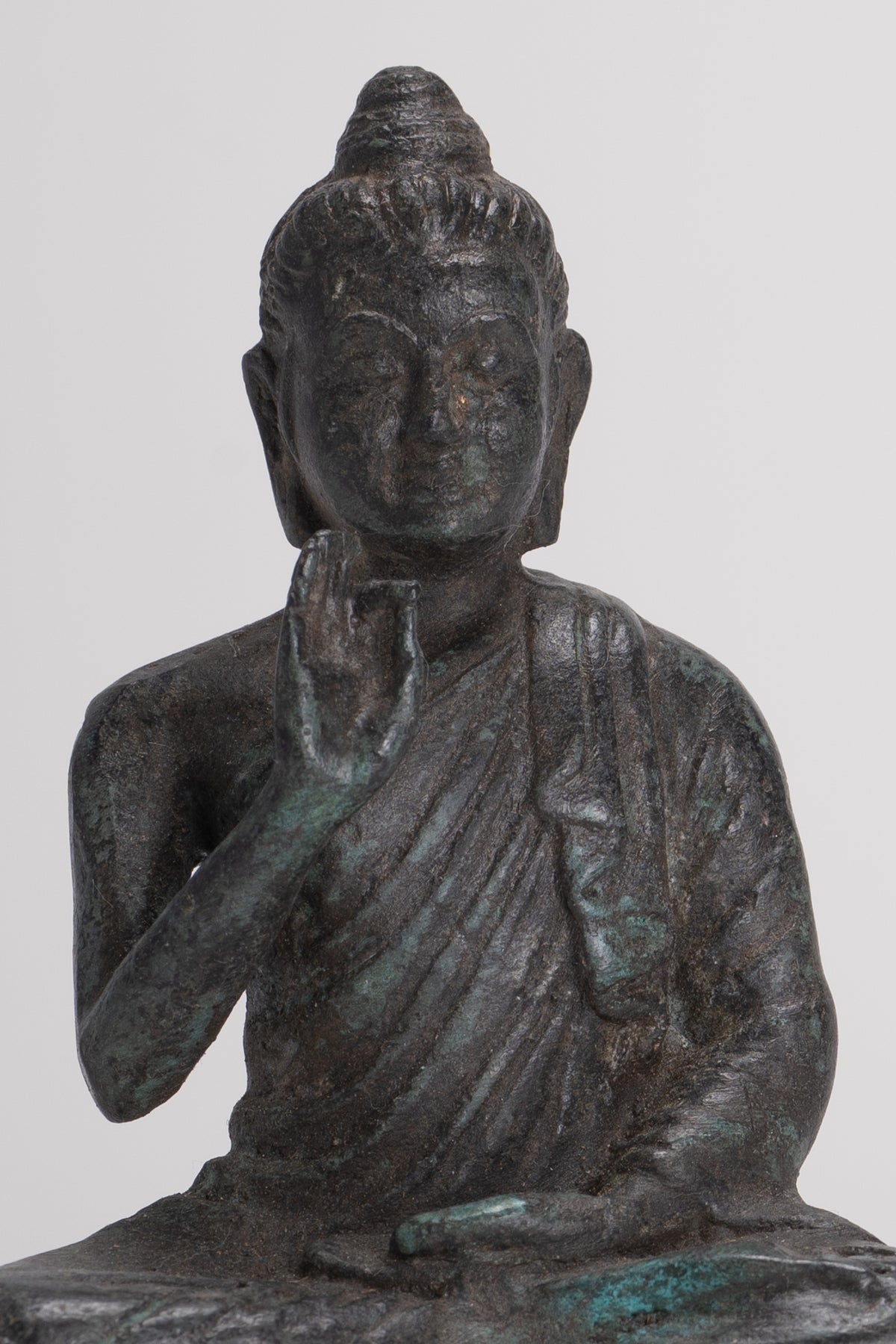Un antico Buddha in stile Gandhara seduto nella posizione di Lotus o Padmasana, con ogni piede posizionato sulla coscia opposta e mani sollevate nel doppio dharmachakra o insegnamento di mudra. Le sue abiti in cascata fluida da entrambe le spalle.In sanscrito dharmachakra significa la "ruota del dharma". Questo mudra simboleggia uno dei momenti più importanti della vita di Buddha, l'occasione in cui predicava ai suoi compagni il primo sermone dopo la sua illuminazione nel parco dei cervi a Sarnath. Indica quindi l'impostazione in movimento della ruota dell'insegnamento del Dharma. In questo mudra il pollice e l'indice toccano le loro punte per formare un cerchio. Questo cerchio rappresenta la ruota del dharma, o in termini metafisici, l'unione del metodo e della saggezza. Questo simboleggia la generosità.