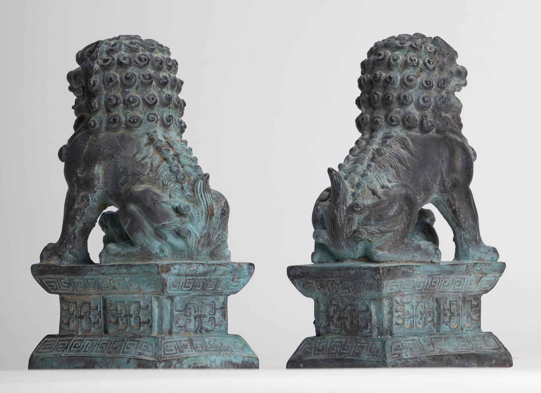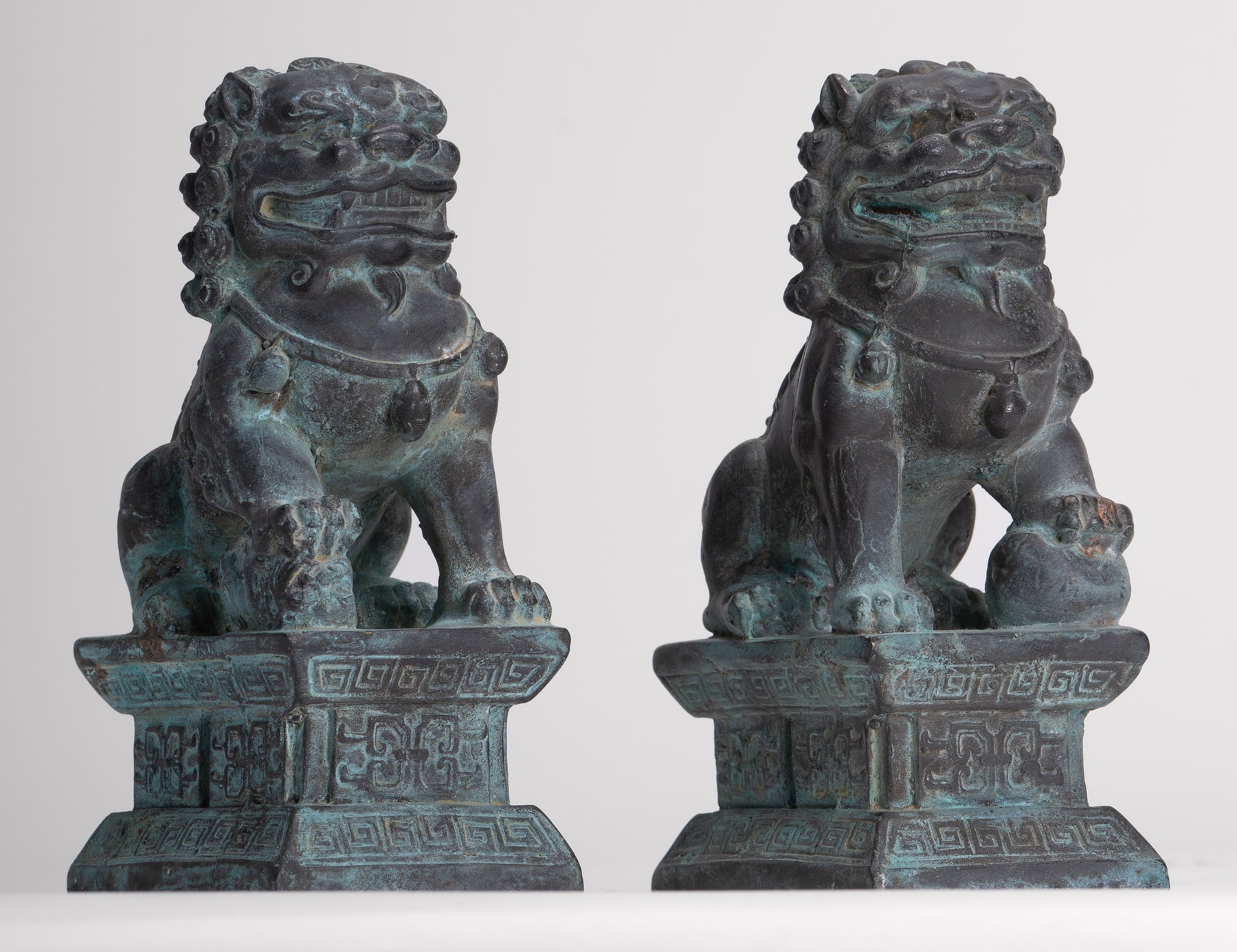 Una coppia di leoni guardiani del tempio in bronzo antico in stile cinese, leoni guardiani imperiali, leoni Shishi o cani Foo.