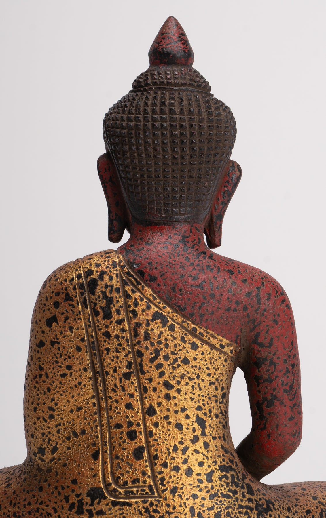 Antica statua di Buddha da meditazione in legno in stile Khmer.