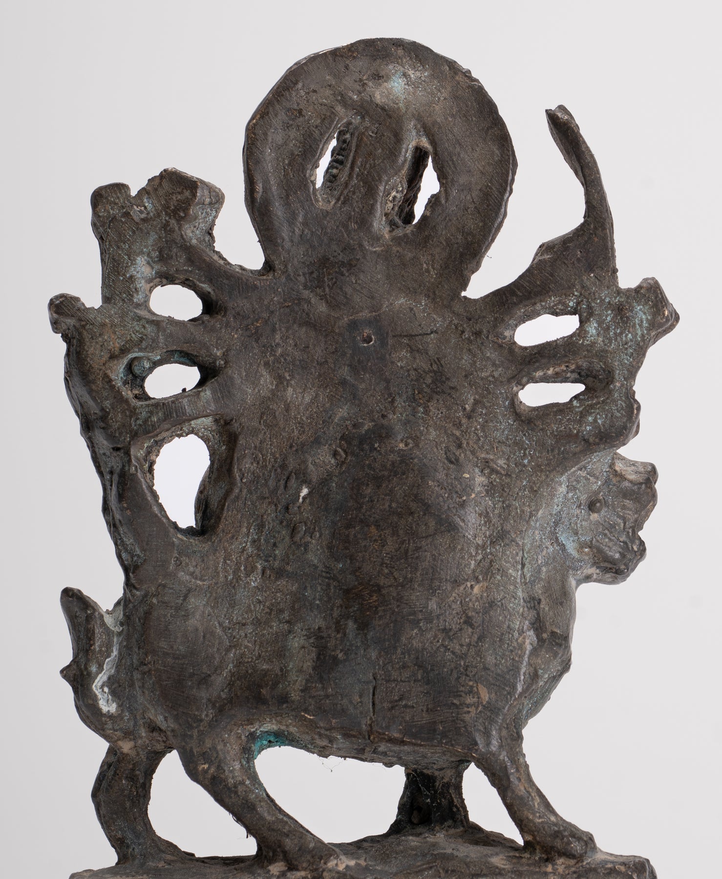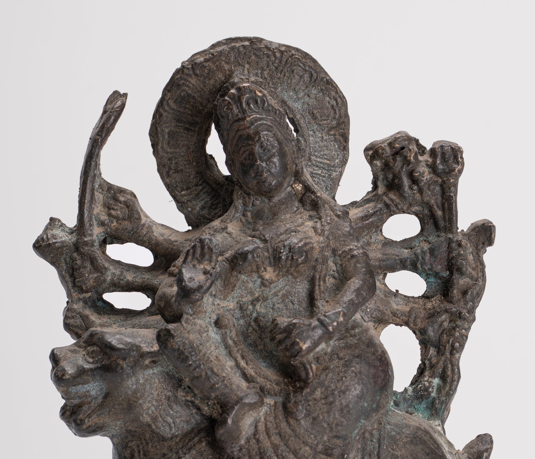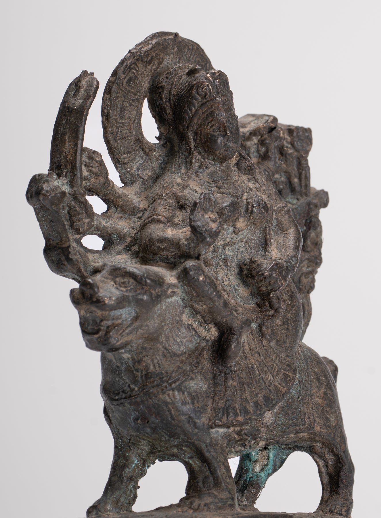 Un bronzo antico in stile Majapahit Chandraghanta Durga seduto su Mahishasura.