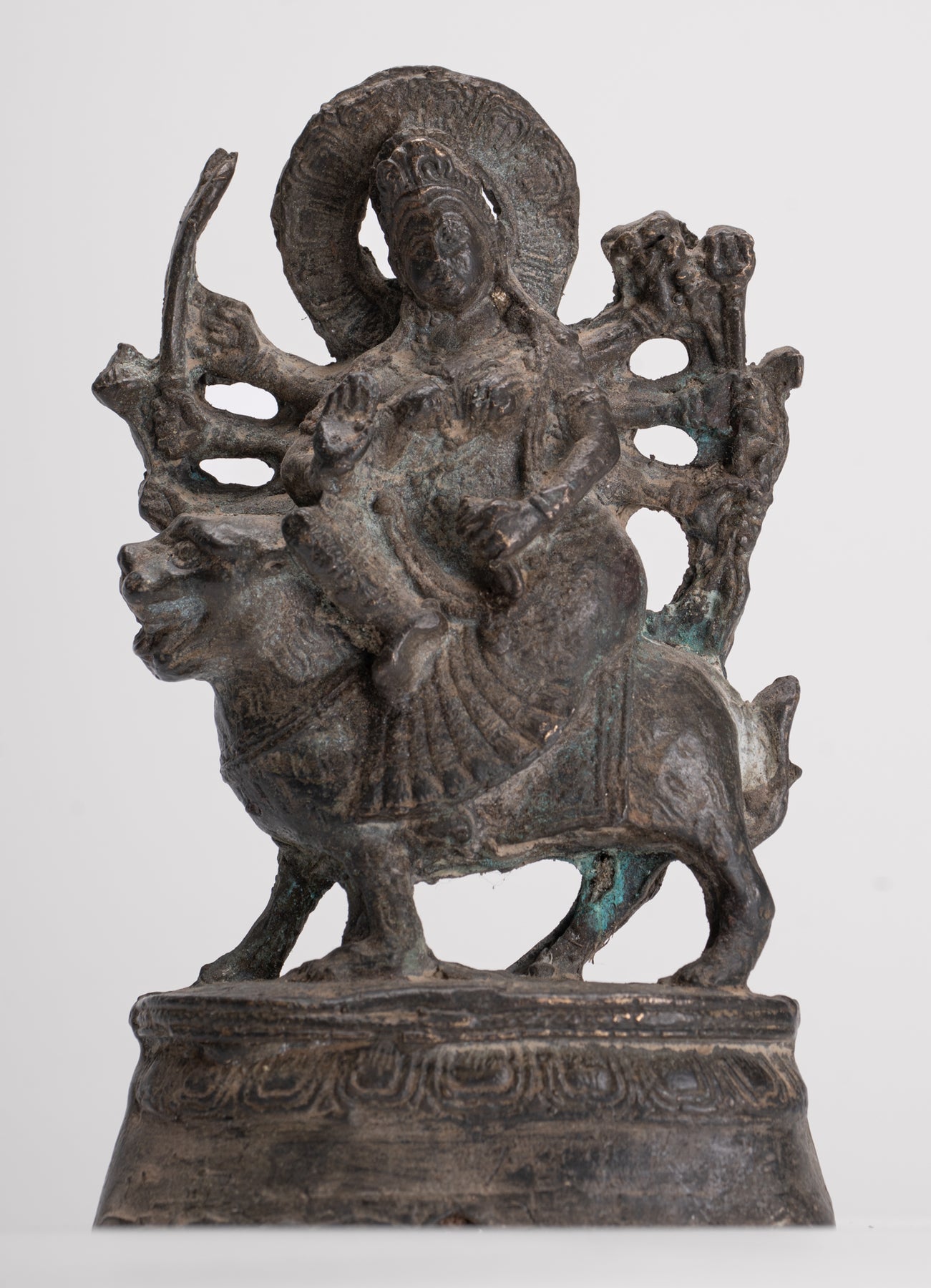 Chandraghanta Durga la dea famosa per aver ucciso il demone bufalo, Mahishasura può essere vista seduta durante il suo trionfo. Mahishasura è seduto su un piedistallo di foglie di loto.