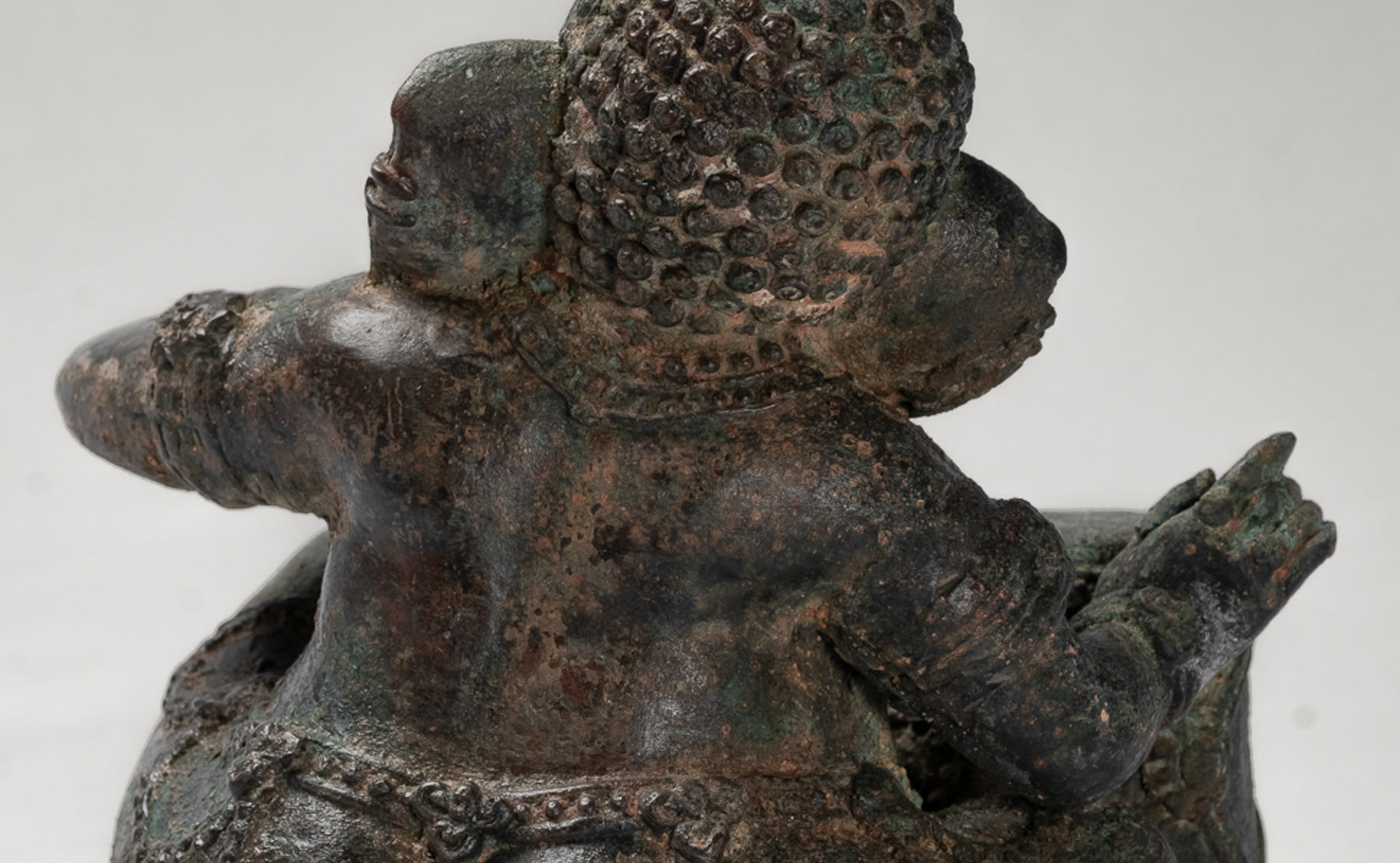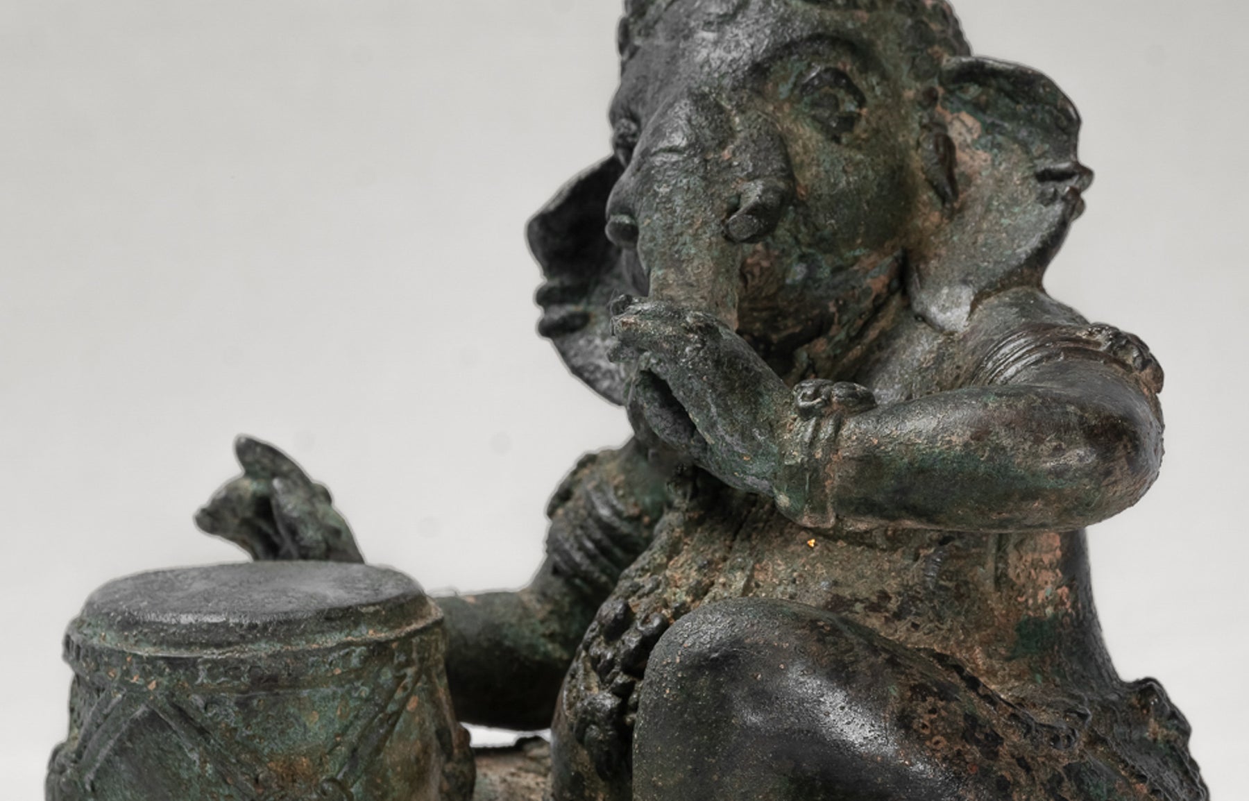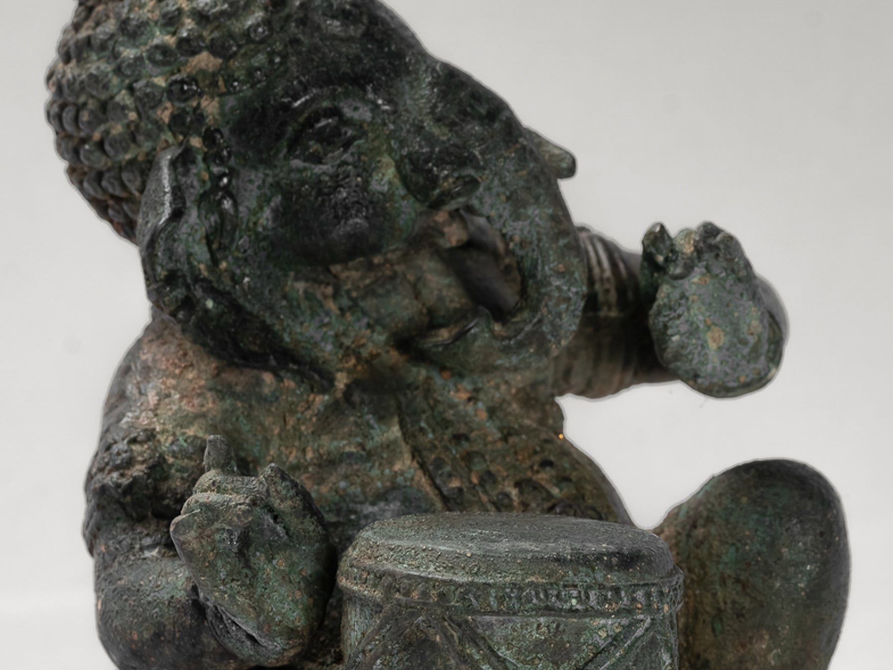 La patina distintiva del pezzo è particolarmente deliziosa. Ganesha è il figlio di Shiva. Qui è seduto suonando il suo tamburo.