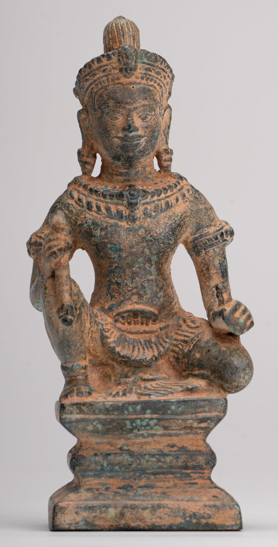 Questa bella scultura in bronzo mostra una divinità maschile (probabilmente Vishnu) seduta su un manico di terra. È vestito con un sampot kpin pieghettato, nello stile Koh Ker, con un fiocco dietro che è stato rappresentato in modo naturalistico per accogliere la posa in ginocchio. L'ingegno dell'artista è particolarmente evidente nel modo in cui il piede sinistro è rappresentato lateralmente nella parte posteriore.