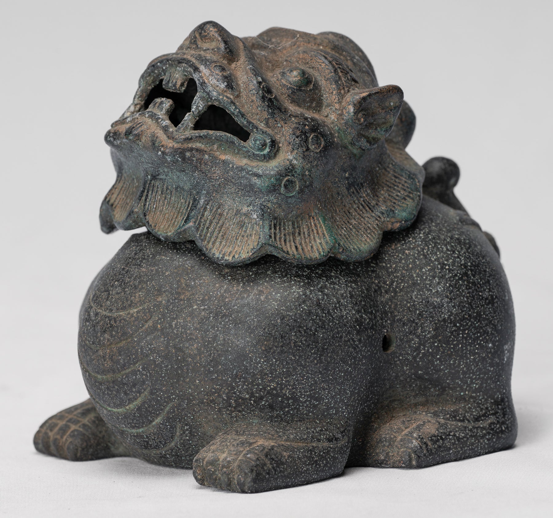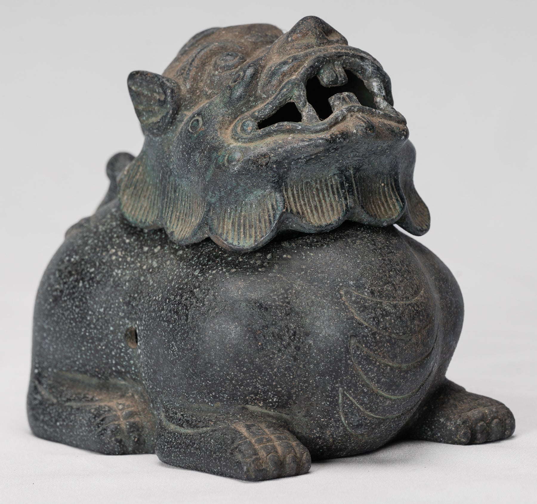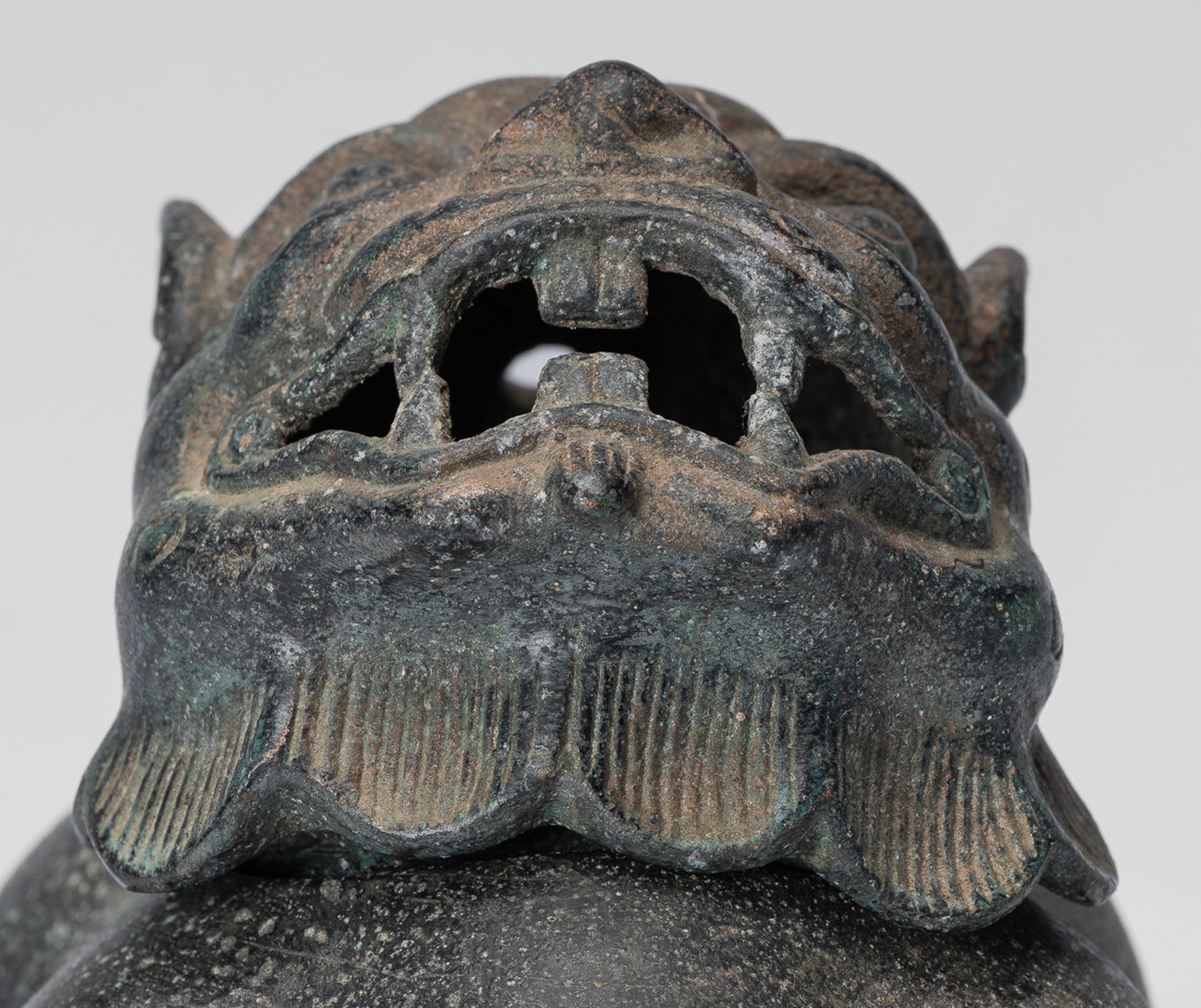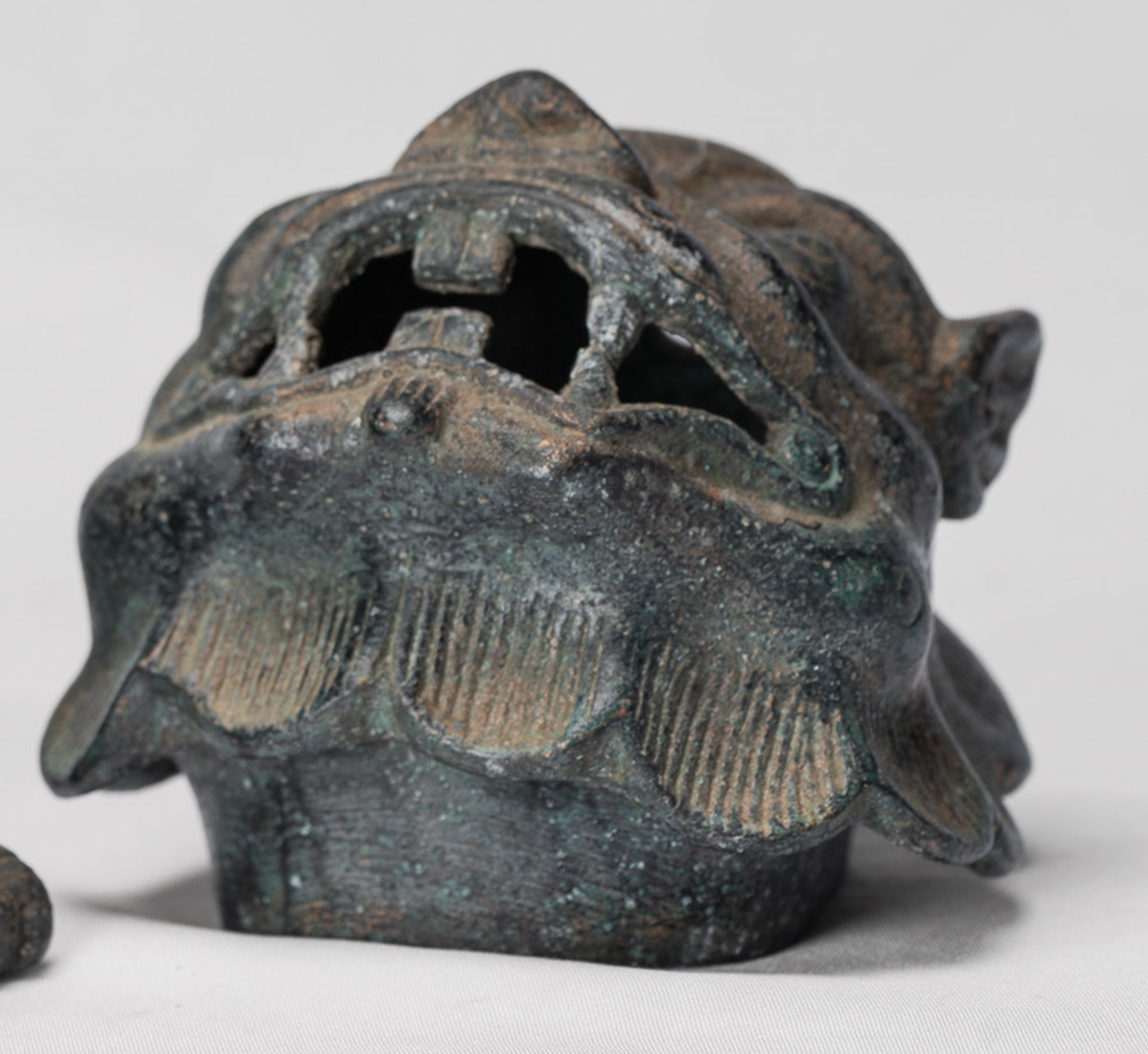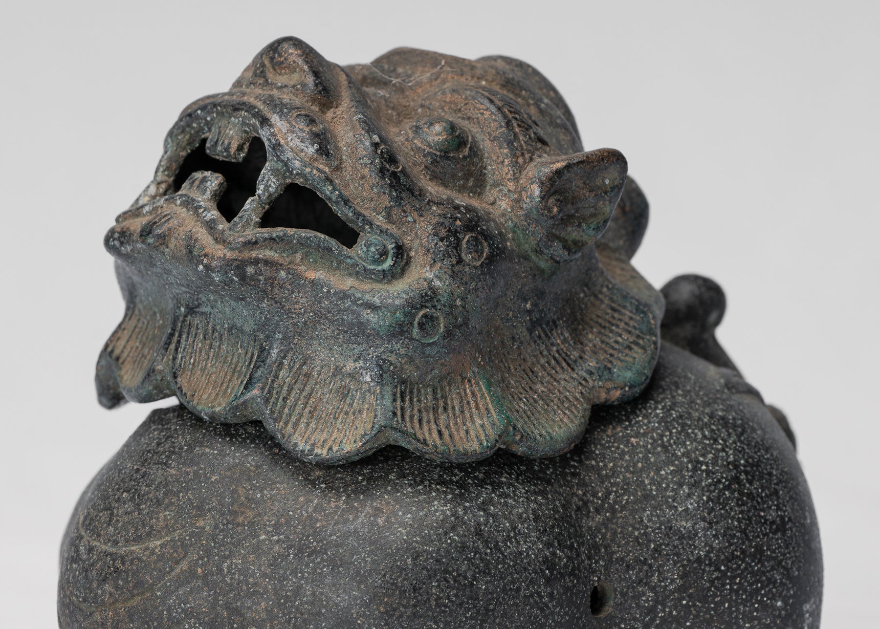 La fusione è di qualità particolarmente elevata, evidente nella modellazione nitida del volto e delle scaglie del drago; ogni dettaglio è reso in modo pulito e sicuro. Una patina distintiva, ammorbidita dal tempo, arricchisce la superficie del bronzo, aggiungendo profondità, carattere e un senso di età.
