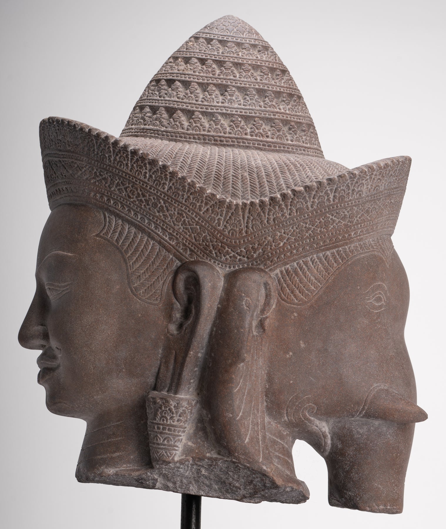 Un'elegante ed estremamente rara doppia testa di Shiva e Ganesha in stile Banteay Srei cambogiano, pre Angkor, X secolo. Il potere che emana da questa immagine avvincente di Shiva e Ganesha caratterizza lo stile Banteay Srei.