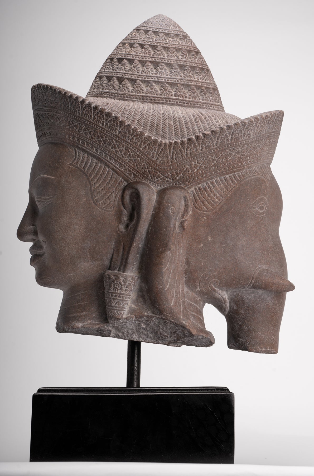 Shiva Ganesha Statue - Antique Banteay Srei Style Khmer Stone Shiva & Ganesha Statue Head - 54cm/22"