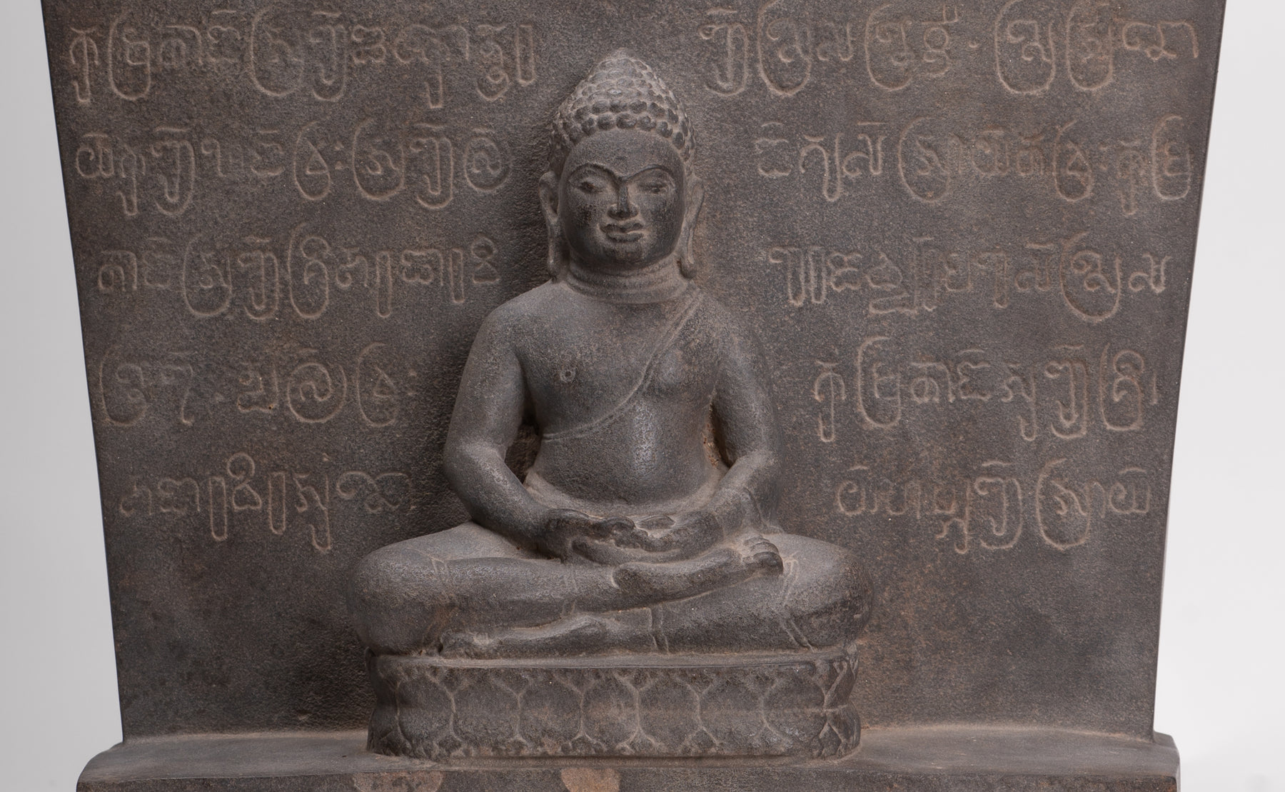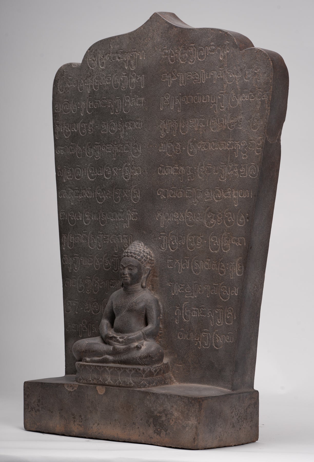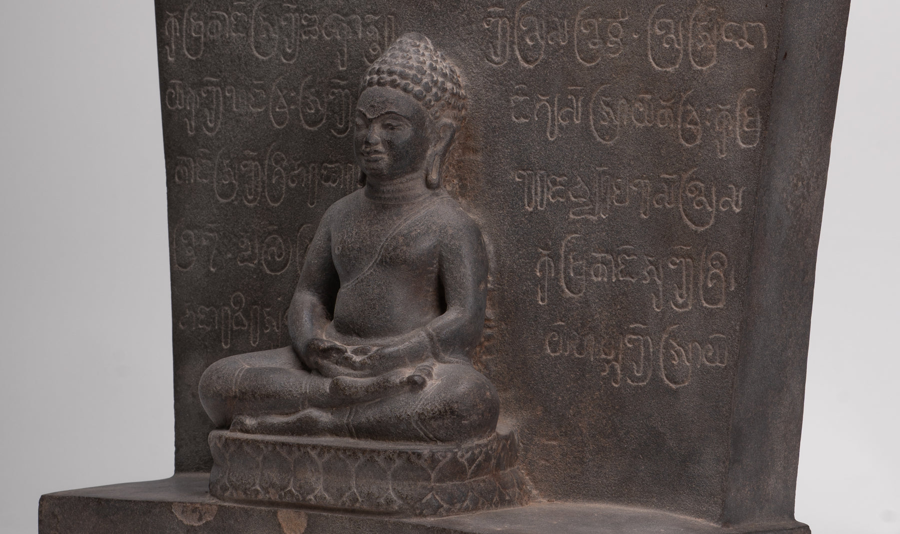 Queste stele non furono mai semplicemente oggetti decorativi. Integrati nel culto quotidiano e nella vita rituale, fornivano punti focali per le offerte, la recitazione e la meditazione, favorendo un'atmosfera condivisa di riverenza e devozione comunitaria. L'iscrizione in sanscrito che circonda il Buddha seduto su questa stele sottolinea la sua duplice funzione sia di immagine sacra che di testimonianza testuale, mentre un ulteriore testo sanscrito sul retro ne arricchisce il significato storico e religioso.
