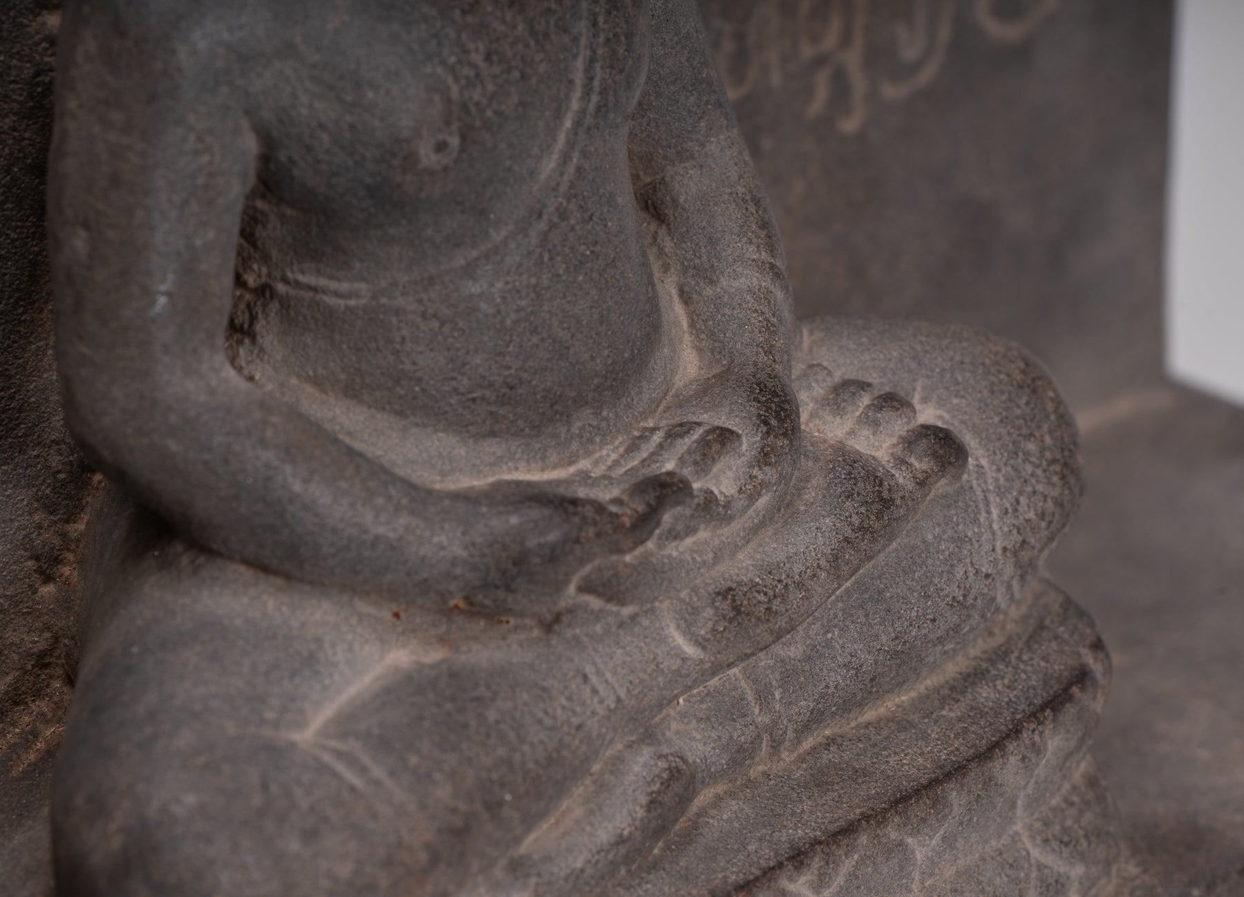 Una stele pre-Angkor in stile Phnom Da del VII secolo raffigurante un Buddha seduto dhyāna (meditazione) mudra. Questo gesto della mano incarna l'energia della meditazione, della contemplazione profonda e dell'unione con la coscienza superiore.