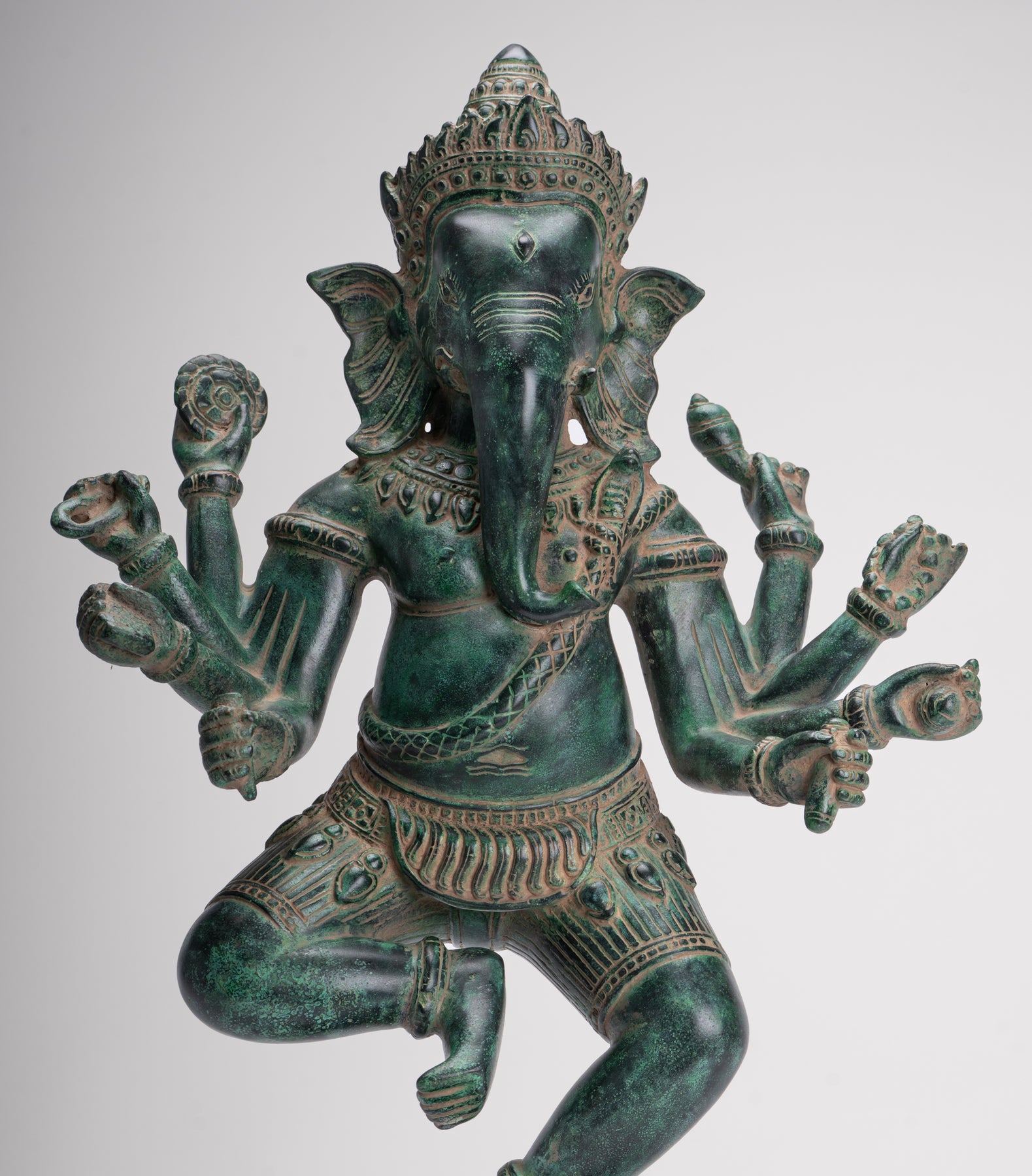 Un antico Ganesha danzante in bronzo in stile Khmer. La patina distintiva del pezzo è particolarmente deliziosa. Ganesha è il figlio di Shiva dalla testa di elefante.