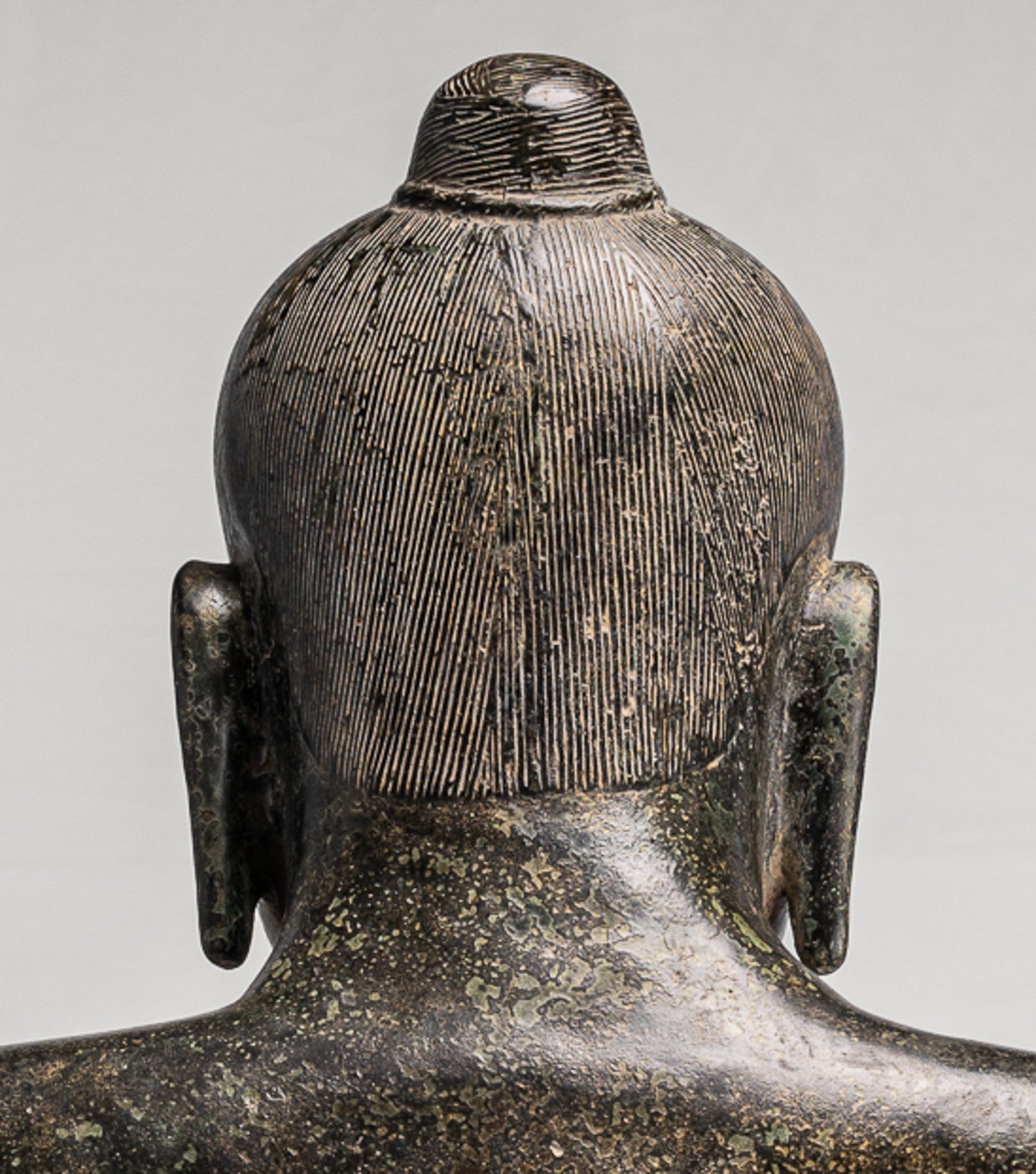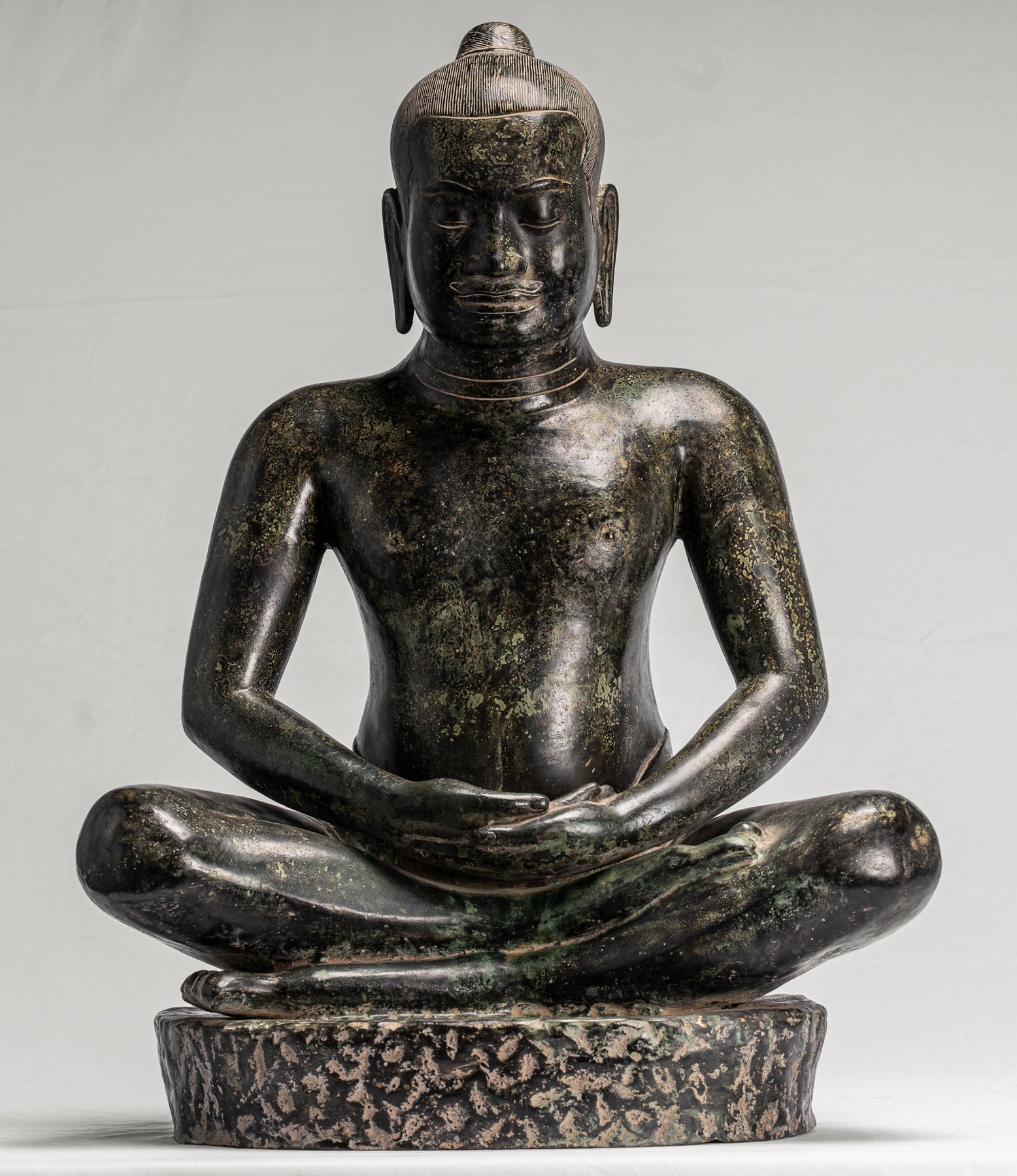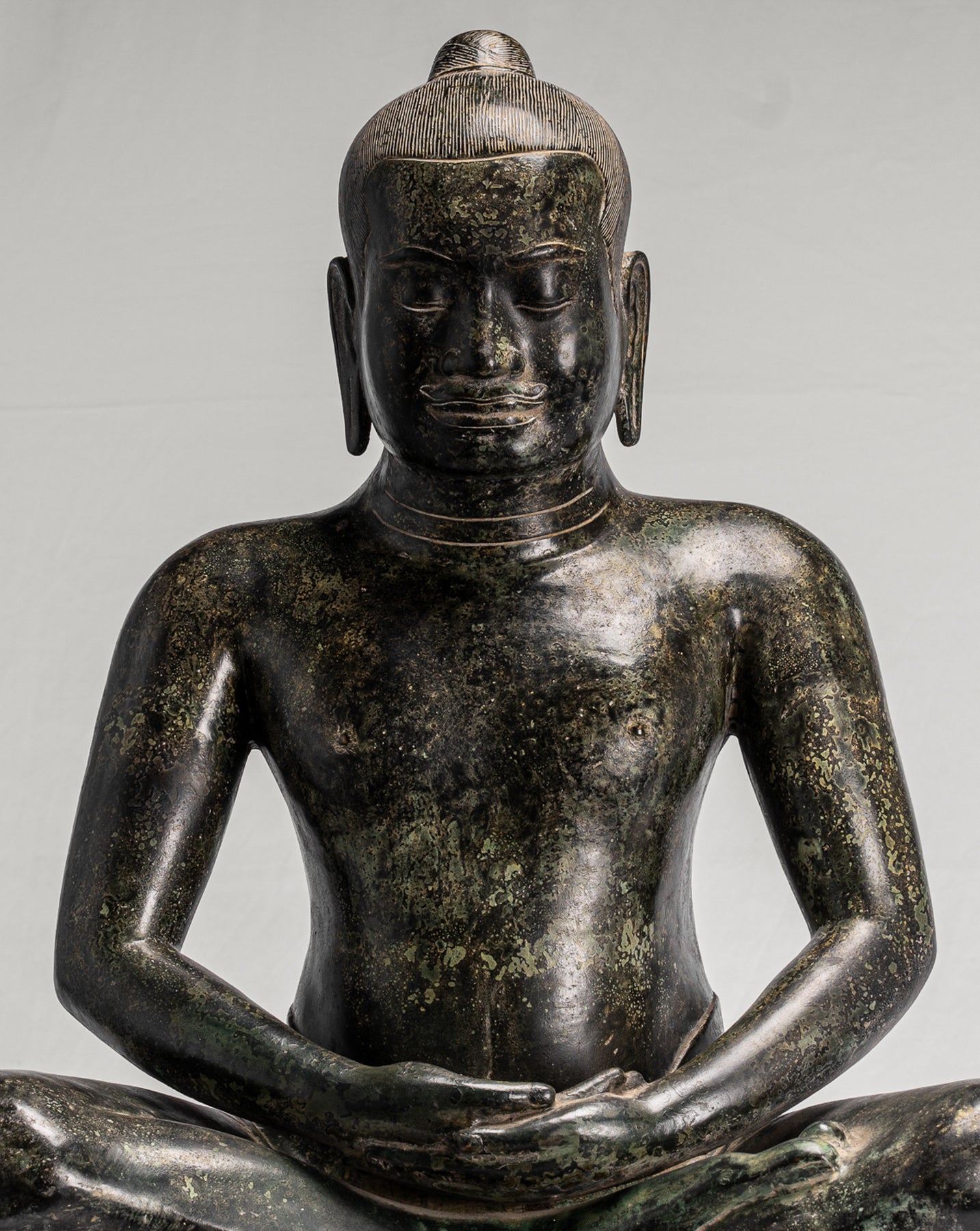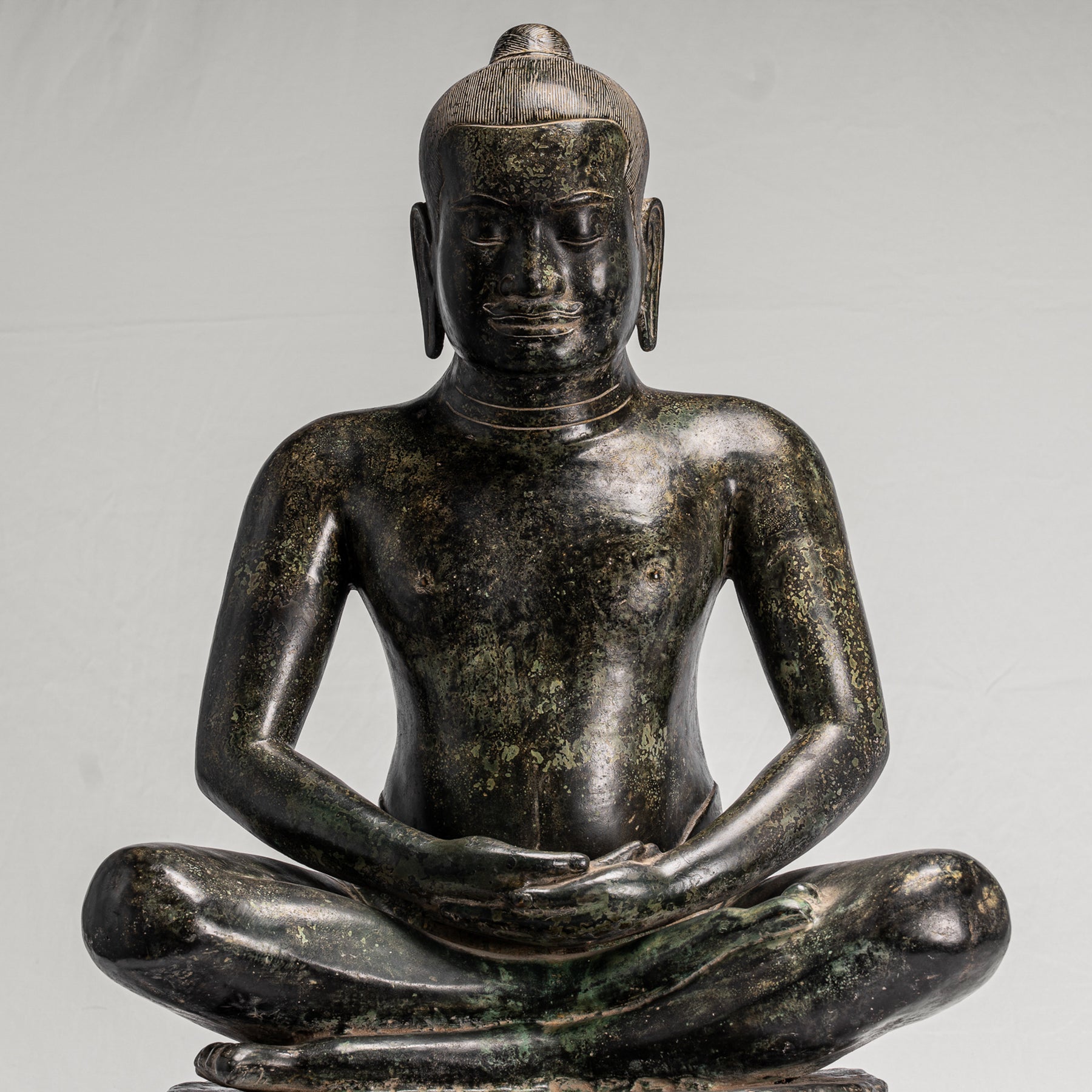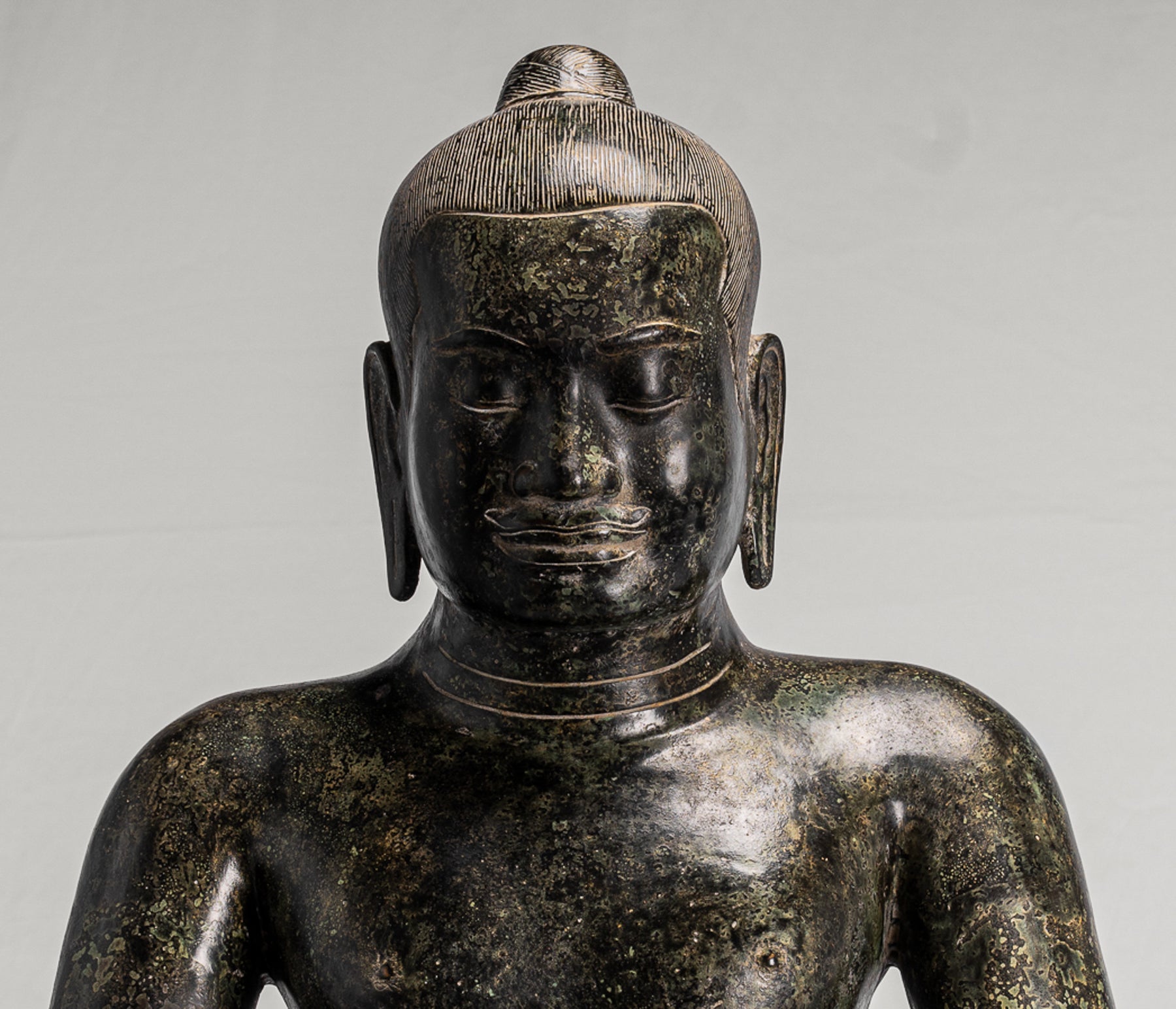 Une imposante sculpture en bronze de style khmer antique de Jayavarman VII. Se déshabitant des attributs royaux ou divins, cette statue du roi Jayavarman VII représente un homme dans la méditation vénérée. Comme c'est traditionnel, ses cheveux sont tirés en arrière et attachés dans un petit chignon comme Chignon. Son expression faciale est accentuée par des yeux semi-fermés, un léger sourire, un grand front, des lèvres qui ne sont ni minces ni épaisses et longues lobes de l'oreille. Tous ces traits représentent la physionomie khmer. Le pouvoir du roi tel qu'il est exprimé par son expression faciale évoque la connaissance suprême, la compassion et la tranquillité.