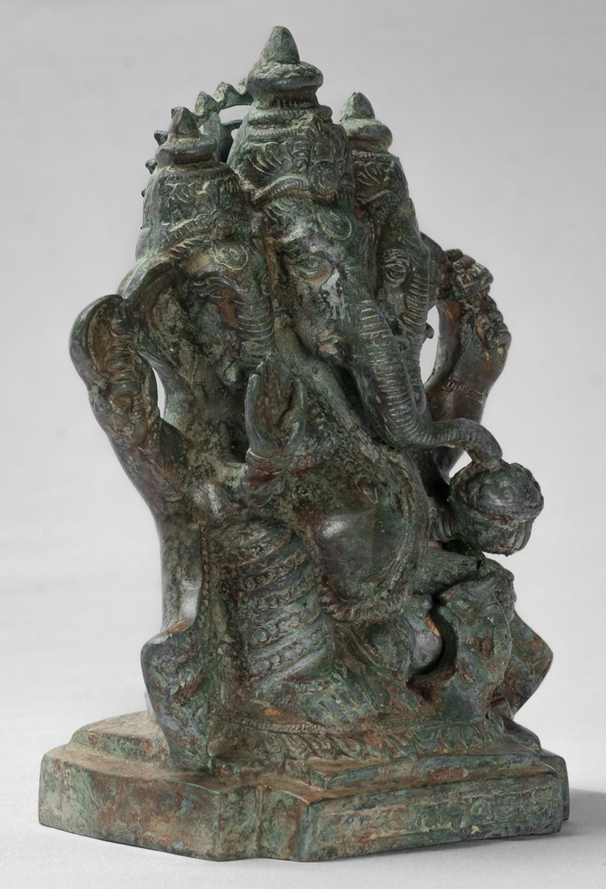 Antique Thai Style Bronze Tri Muhkthi Ganapathi Three Headed Ganesha Statue - 21cm/8"