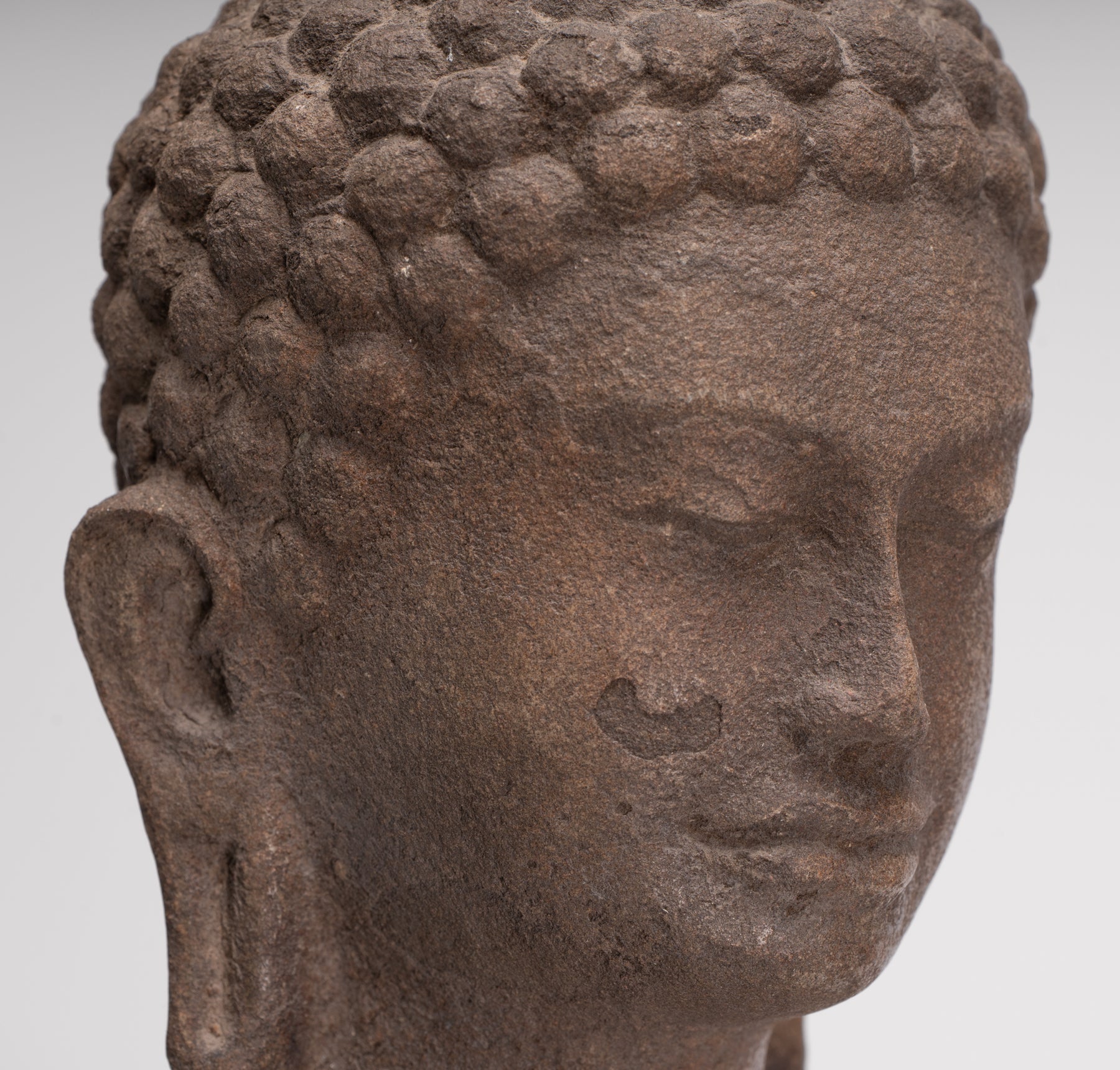 Les cheveux sont représentés en cercles de boucles serrées dont la taille diminue vers l'ushnisha. Les expressions faciales des statues de Bouddha Dvaravati rayonnent de sérénité et de compassion. Le visage a des yeux mi-clos baissés qui suggèrent une méditation intérieure, véhiculent une tranquillité intérieure. Tandis que la douce courbe des lèvres suggère une présence compatissante et bienveillante à travers une bouche plutôt sensuelle et un menton à peine fossette.