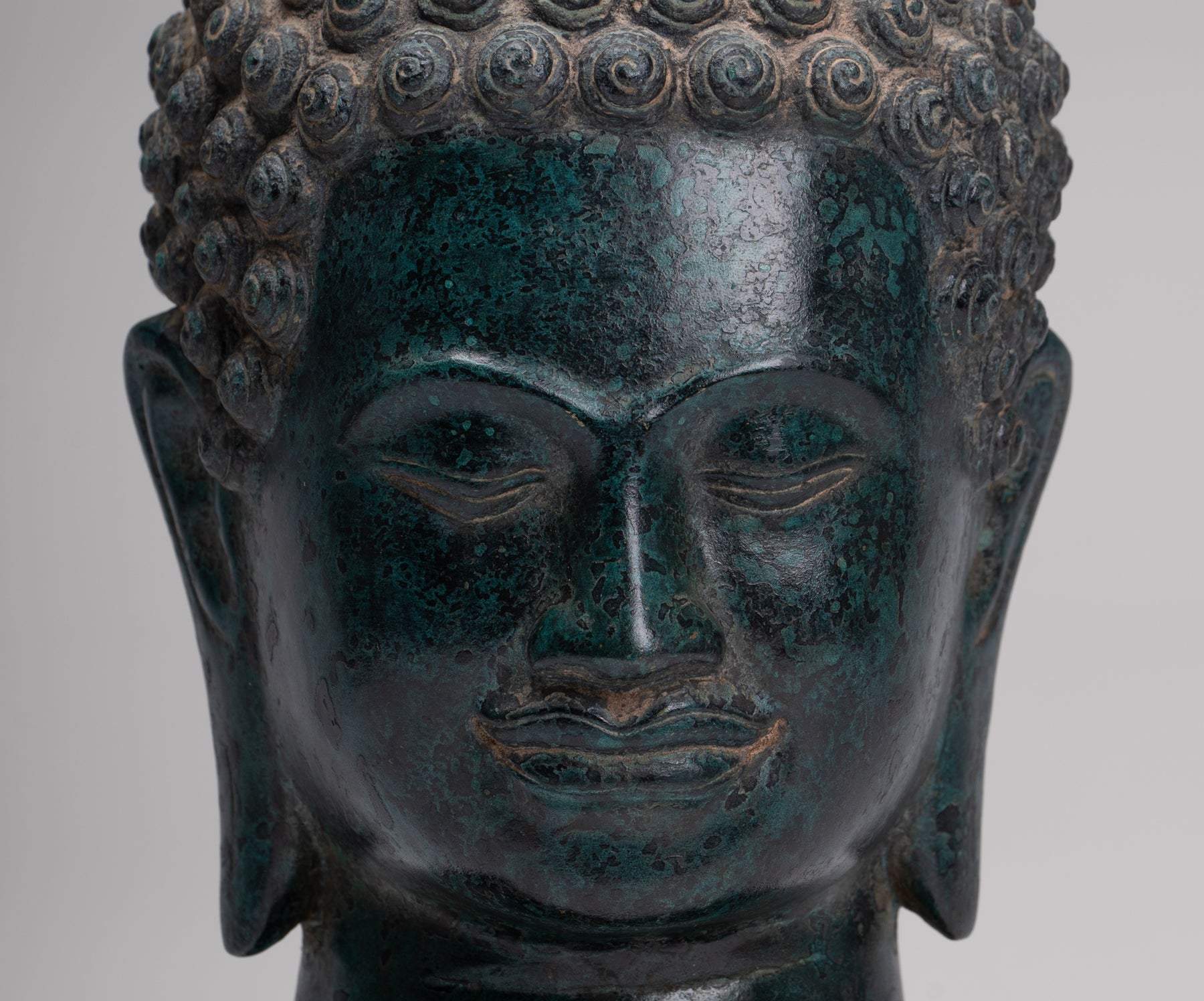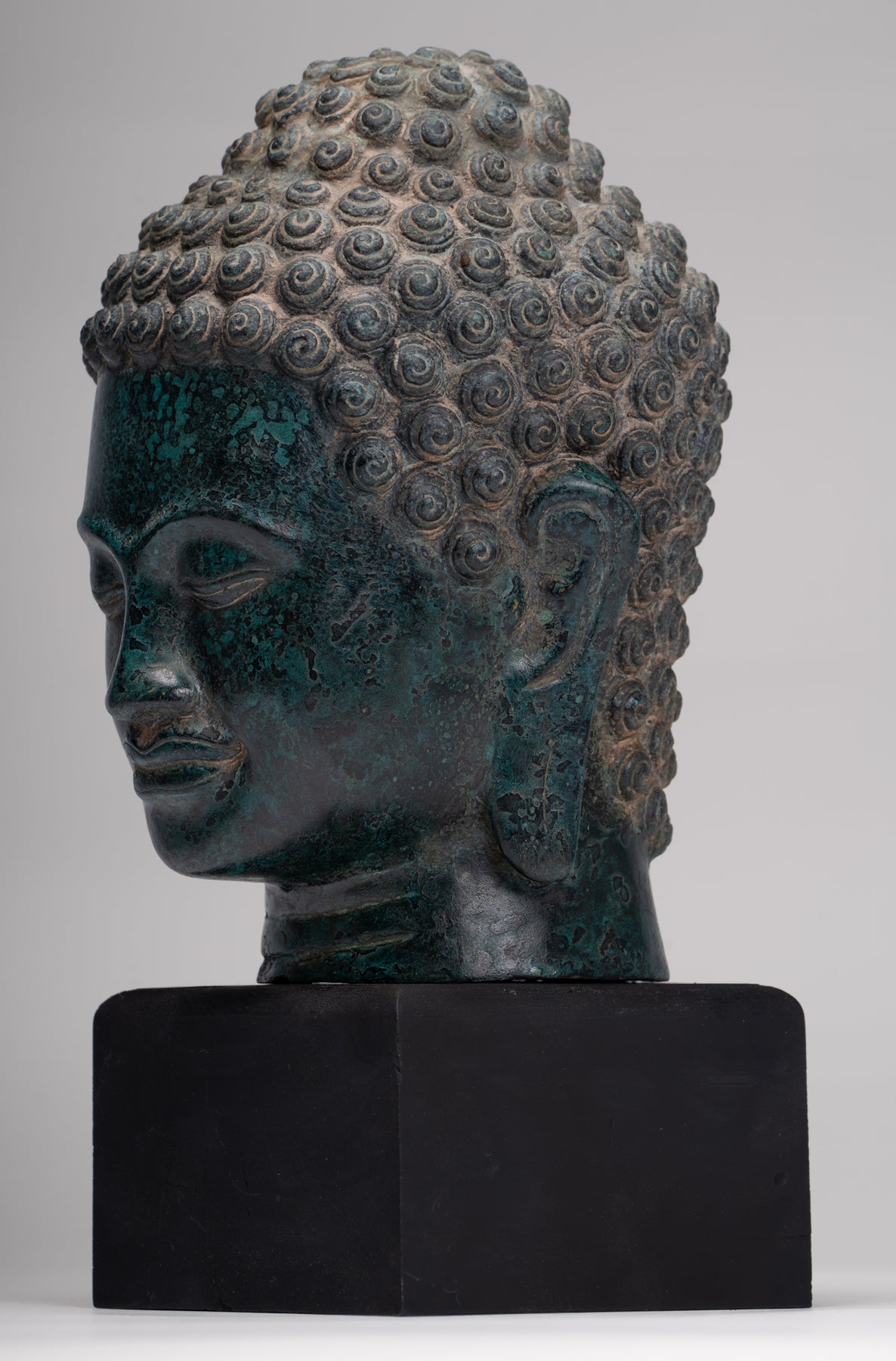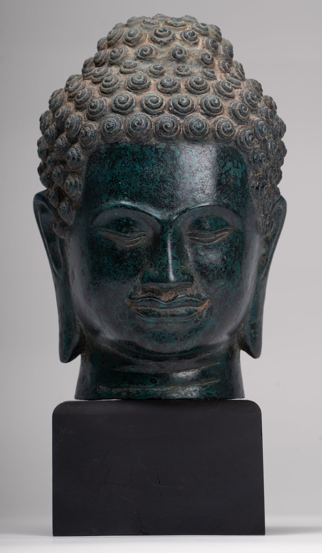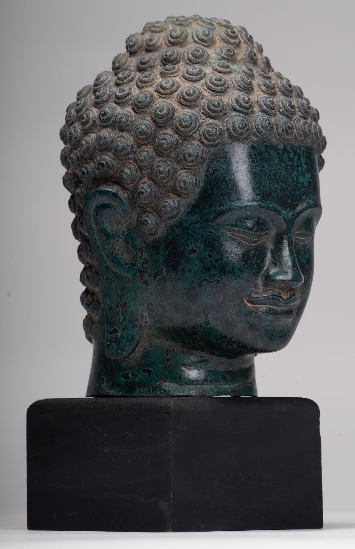 La sculpture est magnifique comme vous pouvez le voir dans les beaux détails du visage. Chaque détail est parfaitement rendu. La patine distinctive de la pièce est également particulièrement délicieuse. Cette pièce en apparence traditionnelle ajoutera à coup sûr sérénité à votre maison, bureau ou espace sacré.