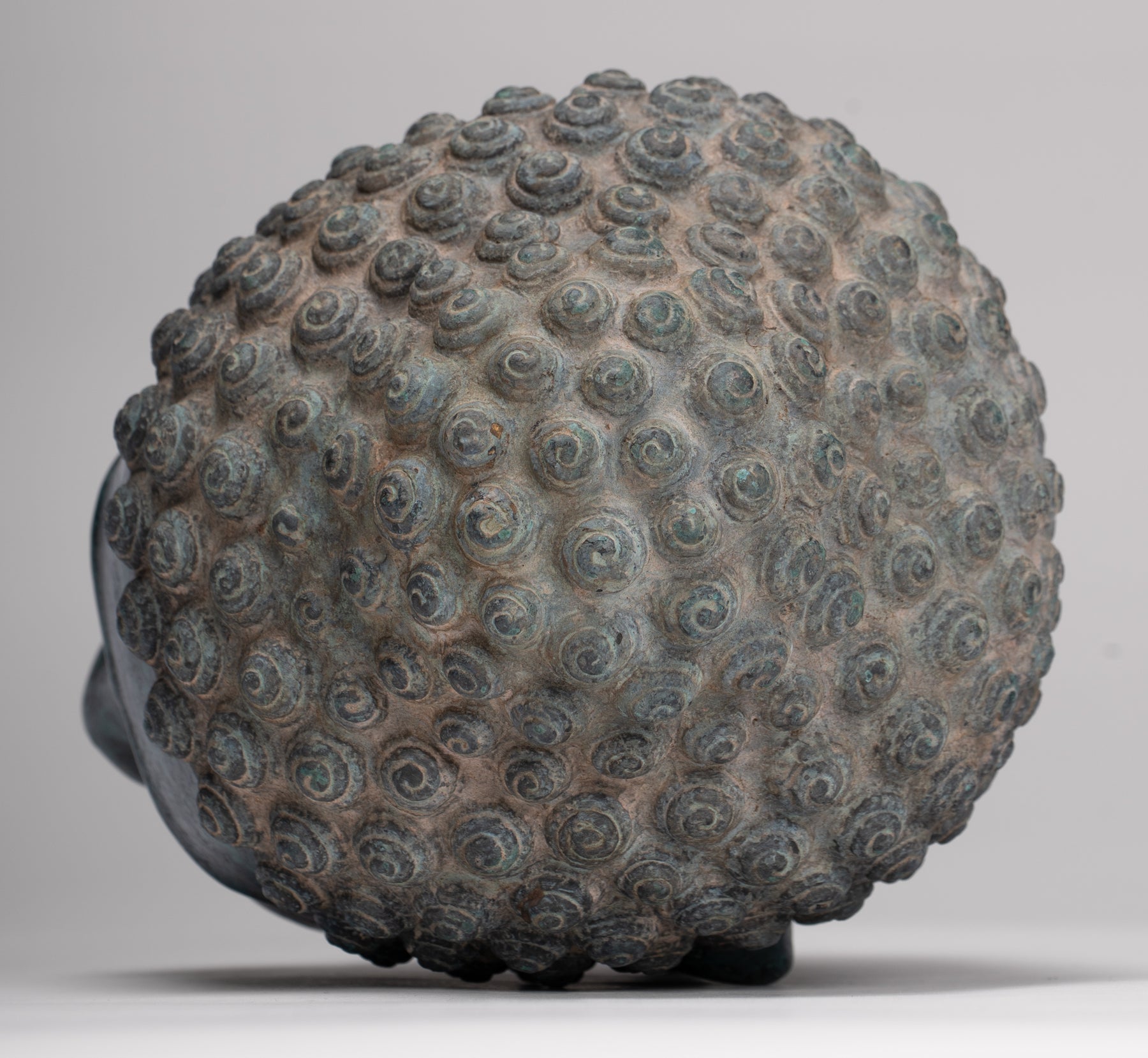 Les cheveux sont représentés en cercles de boucles serrées qui diminuent en taille envers l'Ushnisha. Ce style a été inspiré par les styles Dvaravati du début du septième siècle qui peuvent être retracés aux styles de Gupta Indie.